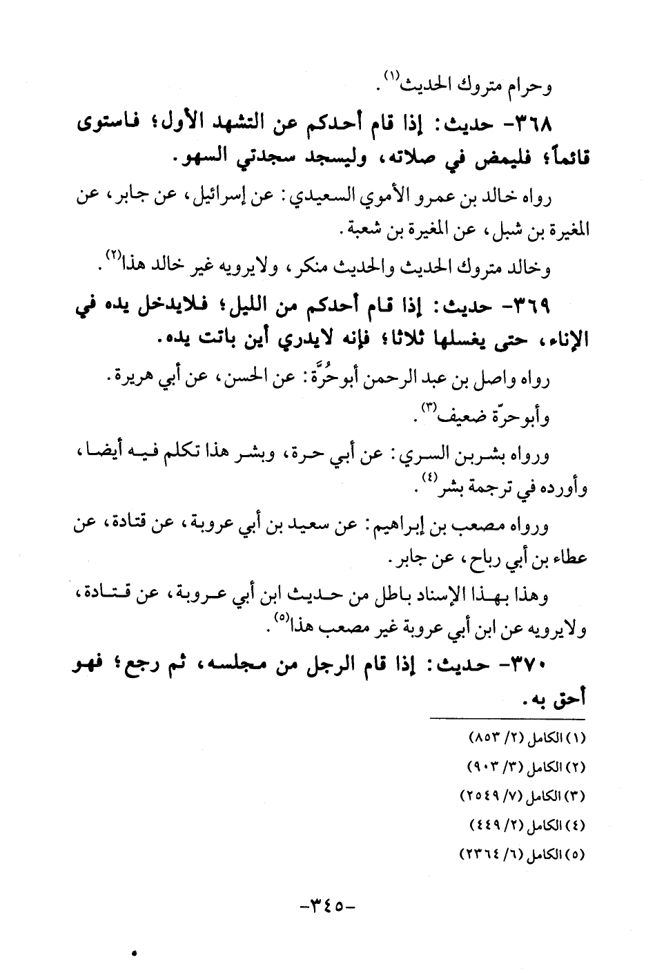 368 - حَدِيث: إِذا قَامَ أحدكُم عَن التَّشَهُّد؛ فَاسْتَوَى قَائِما؛ فليمض فِي صلَاته، وليسجد سَجْدَتي السَّهْو. رَوَاهُ خَالِد بن عَمْرو الْأمَوِي السعيدي: عَن إِسْرَائِيل، عَن جَابر، عَن الْمُغيرَة بن شبْل، عَن الْمُغيرَة بن شُعْبَة. وخَالِد مَتْرُوك الحَدِيث والْحَدِيث مُنكر، ولايرويه غير خَالِد هَذَا.