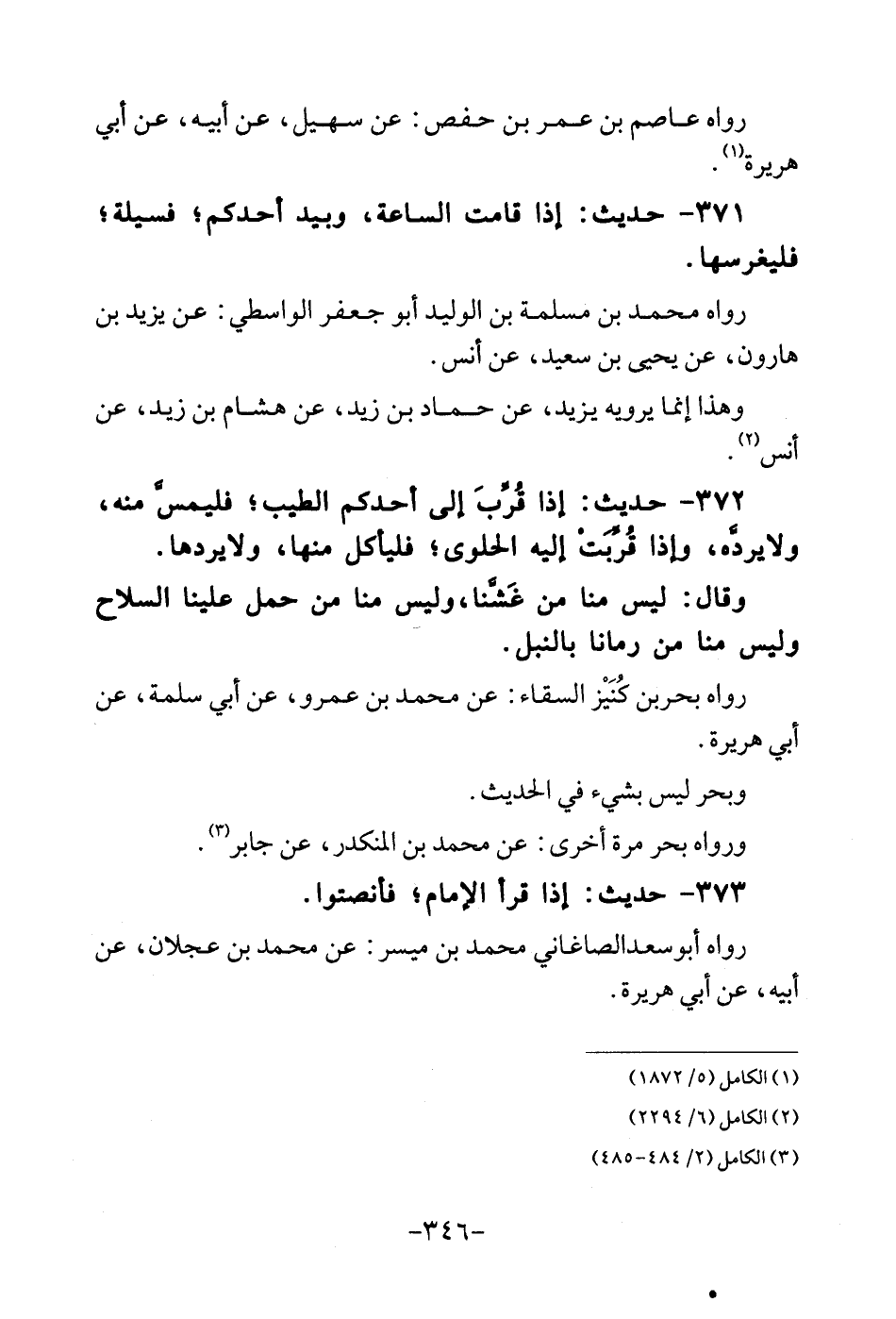 371 - حَدِيث: اذا قَامَت السَّاعَة، وبيد أحدكُم؛ فسيلة، فليغرسها. رَوَاهُ مُحَمَّد بن مسلمة بن الْوَلِيد أَبُو جَعْفَر الوَاسِطِيّ: عَن يزِيد بن هَارُون، عَن يحيى بن سعيد، عَن أنس. وَهَذَا إِنَّمَا يرويهِ يزِيد، عَن حَمَّاد بن زيد، عَن هِشَام بن زيد، عَن أنس.