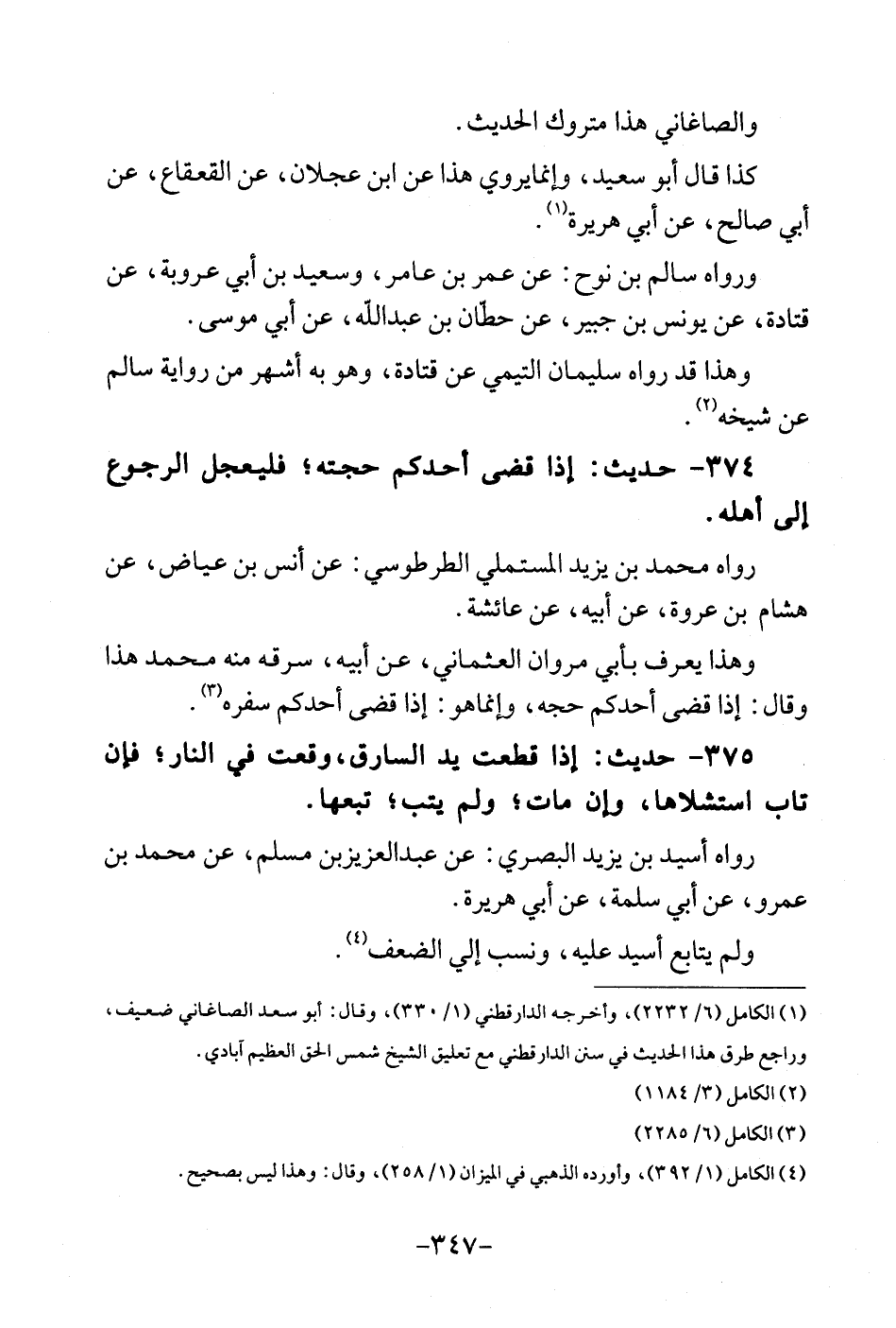 374 - حَدِيث: اذا قض أحدكُم حجَّته؛ فليعجل الرُّجُوع إِلَى أَهله. رَوَاهُ مُحَمَّد بن يزِيد الْمُسْتَمْلِي الطرطوسي: عَن أنس بن عِيَاض، عَن هِشَام بن عُرْوَة، عَن أَبِيه، عَن عَائِشَة. وَهَذَا يعرف بِأبي مَرْوَان العثماني، عَن أَبِيه، سَرقه مِنْهُ مُحَمَّد هَذَا وَقَالَ: إِذا قض أحدكُم حجه، وَإِنَّمَا هُوَ: إِذا قضى أحدكُم سَفَره. 375 - حَدِيث: اذا فطعت يَد السَّارِق، رفعت فِي النَّار؛ فَإِن تَابَ استشلاها، وان مَاتَ؛ وَلم يتب؛ نبعها. رَوَاهُ أسيد بن يزِيد الْبَصْرِيّ: عَن عبد العزيز بن مُسلم، عَن مُحَمَّد بن عَمْرو، عَن أبي سَلمَة، عَن أبي هُرَيْرَة. وَلم يُتَابع أسيد عَلَيْهِ، وَنسب إِلَيّ الضعْف.