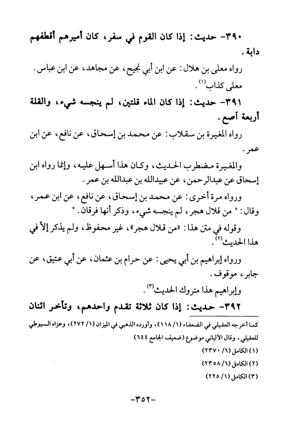 391 - حَدِيث: اذا كَانَ المَاء قُلَّتَيْنِ، لم يُنجسهُ شَيْء، والقلة أَرْبَعَة آصَع. رَوَاهُ الْمُغيرَة بن سقلاب: عَن مُحَمَّد بن إِسْحَاق، عَن نَافِع، عَن ابْن عمر. والمغيرة مُضْطَرب الحَدِيث، وَكَانَ هَذَا أسهل عَلَيْهِ، وَإِنَّمَا رَوَاهُ ابْن إِسْحَاق عَن عبد الرحمن، عَن عبيد الله بن عبد الله بن عمر. وَرَوَاهُ مرّة أُخْرَى: عَن مُحَمَّد بن إِسْحَاق، عَن نَافِع، عَن ابْن عمر، وَقَالَ: " من قلال هجر، لم يُنجسهُ شَيْء، وَذكر أَنَّهَا فرقان. " وَقَوله فِي متن هَذَا: " من قلال هجر "، غير مَحْفُوظ، وَلم يذكر إلاّ فِي هَذَا الحَدِيث. وَرَوَاهُ إِبْرَاهِيم بن أبي يحيى: عَن حرَام بن عُثْمَان، عَن أبي عَتيق، عَن جَابر، مَوْقُوف. وَإِبْرَاهِيم هَذَا مَتْرُوك الحَدِيث.
