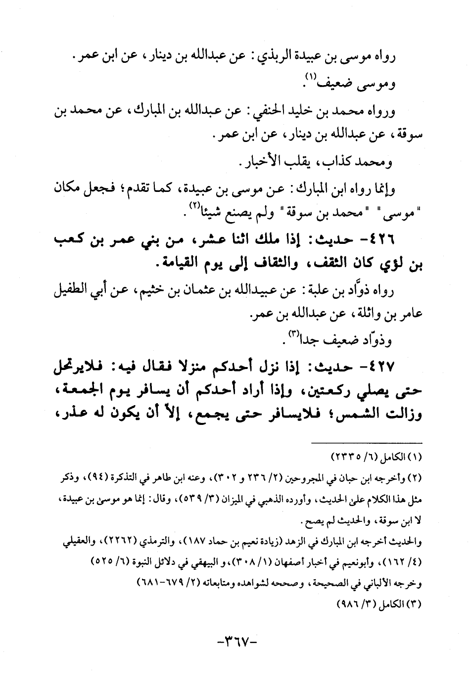 426 - حَدِيث: اذا ملك اثْنَا عشر، من بني عمر بن كَعْب بن لؤَي كَانَ الثقف، والثقاف إِلَى يَوْم الْقِيَامَة. رَوَاهُ ذؤَّاد بن علبة: عَن عبيد الله بن عُثْمَان بن خثيم، عَن أبي الطُّفَيْل عَامر بن وَاثِلَة، عَن عبد الله بن عمر. وذوّاد ضَعِيف جدا.