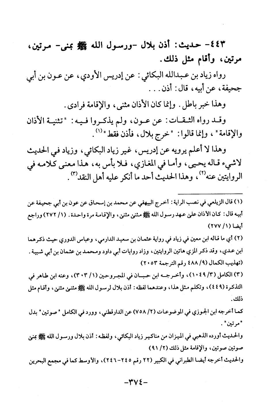 443 - حَدِيث: أذن بِلَال - وَرَسُول الله - صلى الله عَلَيْهِ وَسلم - بمنى - مرَّتَيْنِ، مرَّتَيْنِ، وَأقَام مثل ذَلِك. رَوَاهُ زِيَاد بن عبد الله البكائي: عَن إِدْرِيس الأودي، عَن عون بن أبي جُحَيْفَة، عَن أَبِيه، قَالَ: أذن ... وَهَذَا خبر بَاطِل. وَإِنَّمَا كَانَ الْأَذَان مثنى، وَالْإِقَامَة فُرَادَى. وَقد رَوَاهُ الثِّقَات: عَن عون، وَلم يذكرُوا فِيهِ: " تَثْنِيَة الْأَذَان وَالْإِقَامَة "، وَإِنَّمَا قَالُوا: " خرج بِلَال، فَأذن فَقَط ". وَهَذَا لَا أعلم يرويهِ عَن إِدْرِيس، غير زِيَاد البكائي، وَزِيَاد فِي الحَدِيث لاشيء قَالَه يحيى، وَأما فِي الْمَغَازِي، فَلَا بَأْس بِهِ، هَذَا معنى كَلَامه فى الرِّوَايَتَيْنِ عَنهُ، وَهَذَا الحَدِيث أحد مَا أنكر عَلَيْهِ أهل النَّقْد.