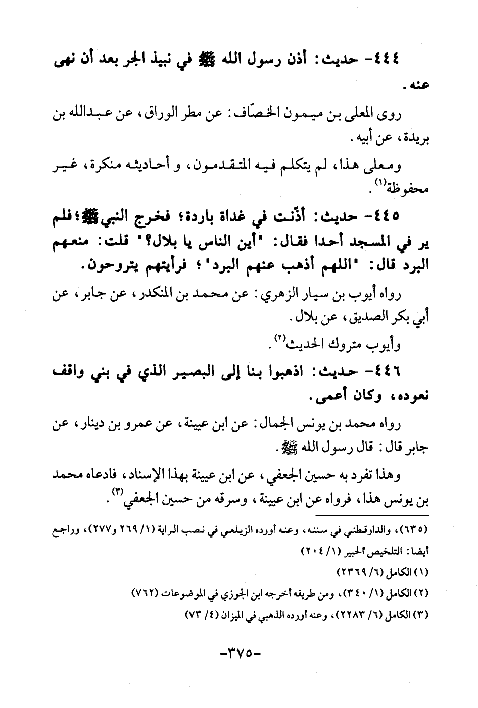 445 - حَدِيث: أذّنت فِي غَدَاة بَارِدَة؛ فَخرج النَّبِي - صلى الله عَلَيْهِ وَسلم - فَلم ير فِي الْمَسْجِد أحدا فَقَالَ: " أَيْن النَّاس يَا بِلَال؟ " قلت: مَنعهم الْبرد قَالَ: " اللَّهُمَّ أذهب عَنْهُم الْبرد "؛ فرأيتهم يتروحون. رَوَاهُ أَيُّوب بن سيار الزُّهْرِيّ: عَن مُحَمَّد بن الْمُنْكَدر، عَن جَابر، عَن أبي بكر الصّديق، عَن بِلَال. وَأَيوب مَتْرُوك الحَدِيث.