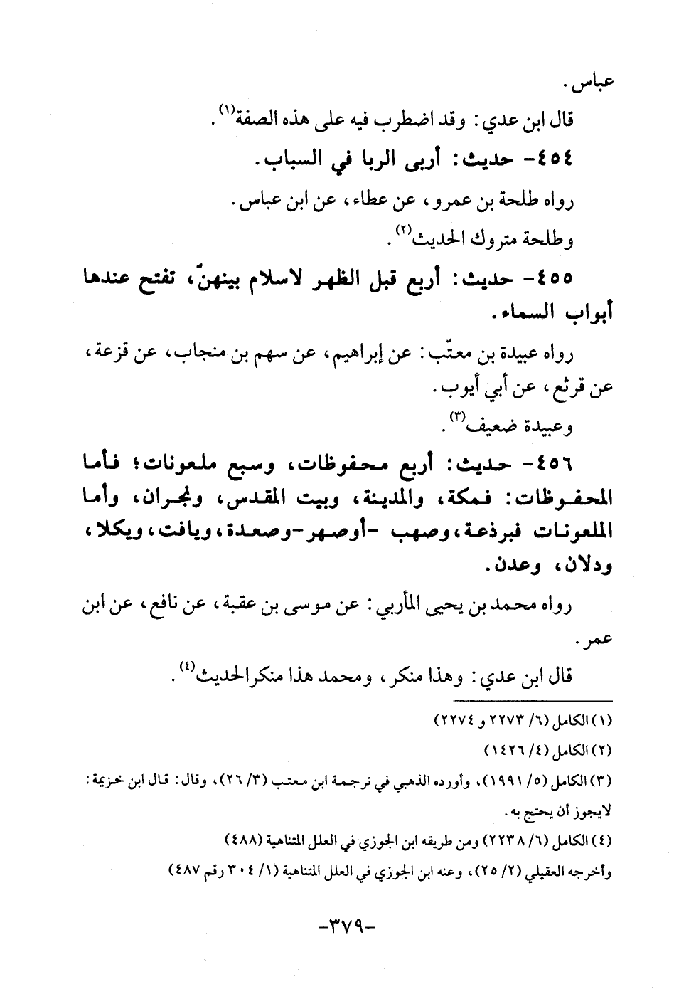 456 - حَدِيث: أَربع محفوظات، وَسبع ملعونات؛ فَمَا المحفوظات: فمكة، وَالْمَدينَة، وَبَيت الْمُقَدّس، ونجران، وَأما الملعونات فبرذعة، وصهب - أَو صهر - وصعدة، ويافت، ويكلا، ودلان، وعدن. رَوَاهُ مُحَمَّد بن يحى المأربي: عَن مُوسَى بن عقبَة، عَن نَافِع، عَن ابْن عمر. قَالَ ابْن عدي: وَهَذَا مُنكر، وَمُحَمّد هَذَا منكرالحديث.
