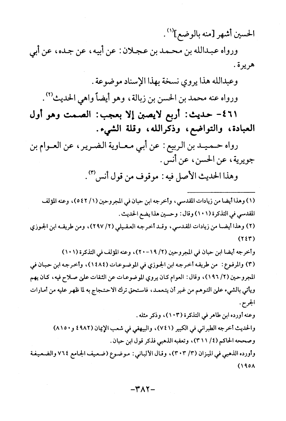 الْحُسَيْن أشهر [مِنْهُ بِالْوَضْعِ] . وَرَوَاهُ عبد الله بن مُحَمَّد بن عجلَان: عَن أَبِيه، عَن جده، عَن أبي هُرَيْرَة. وعبد الله هَذَا يروي نُسْخَة بِهَذَا الْإِسْنَاد مَوْضُوعَة. وَرَوَاهُ عَنهُ مُحَمَّد بن الْحسن بن زبالة، وَهُوَ أَيْضا واهي الحَدِيث. 461 - حَدِيث: أَربع لايصبن الا بعجب: الصمت وَهُوَ أول الْعِبَادَة، والتواضع، وذكرالله، وَقلة الشَّيْء. رَوَاهُ حميد بن الرّبيع: عَن أبي مُعَاوِيَة الضَّرِير، عَن الْعَوام بن جوَيْرِية، عَن الْحسن، عَن أنس. وَهَذَا الحَدِيث الأَصْل فِيهِ: مَوْقُوف من قَول أنس.