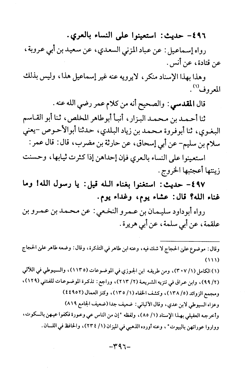 496 - حَدِيث: اسْتَعِينُوا على النِّسَاء بالعري. رَوَاهُ إِسْمَاعِيل: عَن عباد الْمُزنِيّ السَّعْدِيّ، عَن سعيد بن أبي عرُوبَة، عَن قَتَادَة، عَن أنس. وَهَذَا بِهَذَا الْإِسْنَاد مُنكر، لايرويه عَنهُ غير إِسْمَاعِيل هَذَا، وَلَيْسَ بذلك الْمَعْرُوف. قَالَ الْمَقْدِسِي: وَالصَّحِيح أَنه من كَلَام عمر رَضِي الله عَنهُ. ثَنَا أَحْمد بن مُحَمَّد الْبَزَّار، أنبأ أبوطاهر المخلص، ثَنَا أَبُو الْقَاسِم الْبَغَوِيّ، ثَنَا أبوفروة مُحَمَّد بن زِيَاد الْبَلَدِي، حَدثنَا أَبُو الْأَحْوَص - يَعْنِي سَلام بن سليم - عَن أبي إِسْحَاق، عَن حَارِثَة بن مضرب، قَالَ: قَالَ عمر: اسْتَعِينُوا على النِّسَاء بالعري فَإِن إِحْدَاهُنَّ إِذا كثرت ثِيَابهَا، وَحسنت زينتها أعجتبها الْخُرُوج.