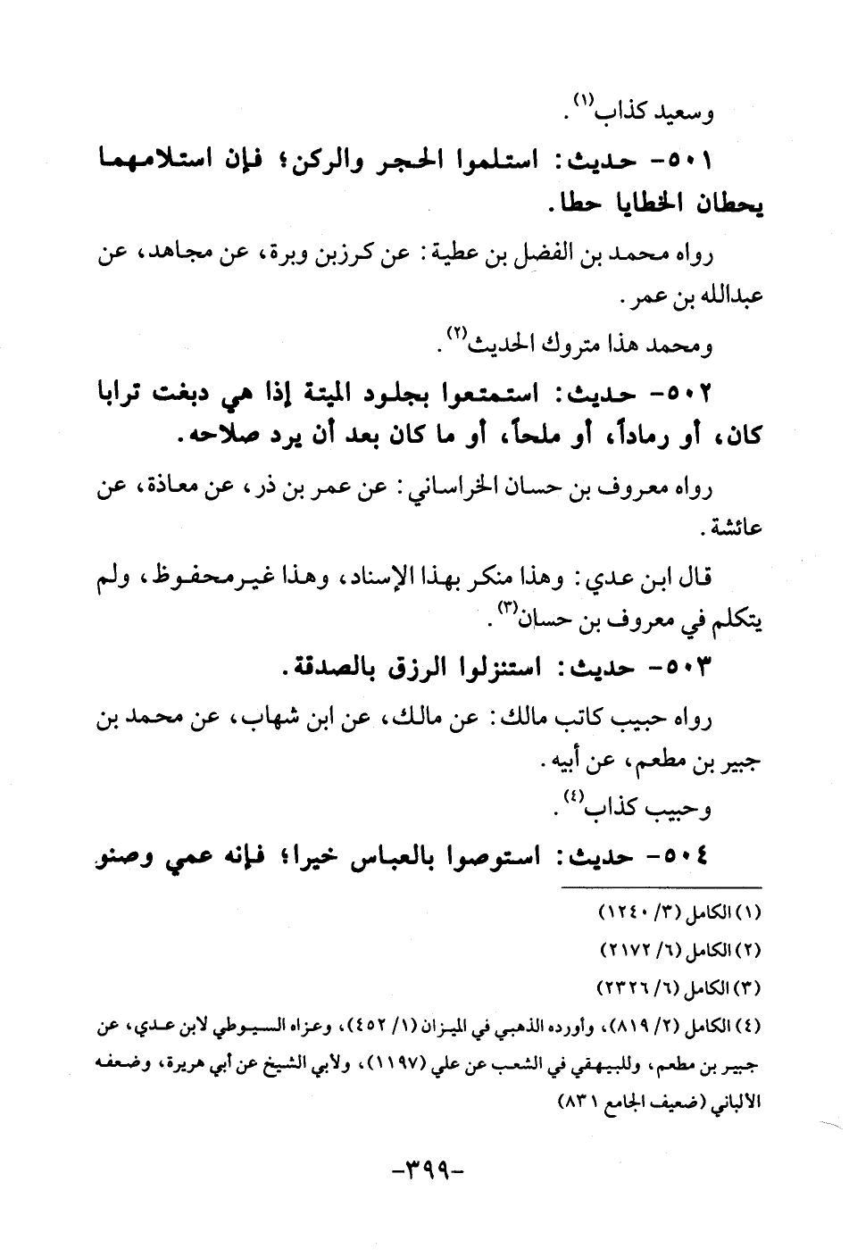 501 - حَدِيث: استلموا الْحجر والركن؛ فَإِن استلامهما يحطان الْخَطَايَا حطا. رَوَاهُ مُحَمَّد بن الْفضل بن عَطِيَّة: عَن كرز بن وبرة، عَن مُجَاهِد، عَن عبد الله بن عمر. وَمُحَمّد هَذَا مَتْرُوك الحَدِيث.