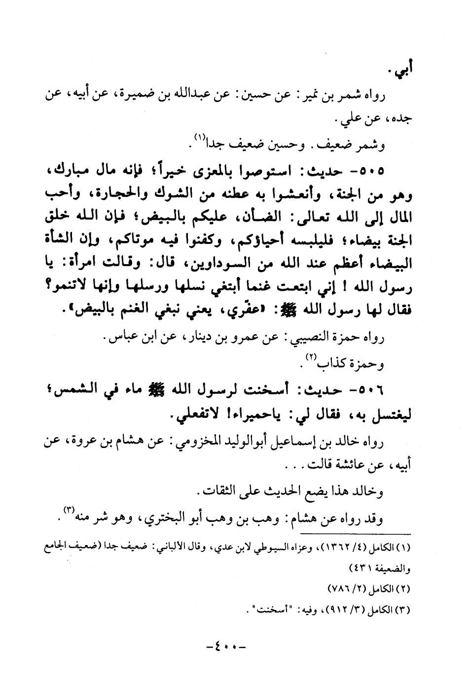 506 - حَدِيث: أسخنت لرَسُول الله - صلى الله عَلَيْهِ وَسلم - مَاء فِي الشَّمْس؛ ليغتسل بِهِ، فَقَالَ لي: ياحميراء} لاتفعلي. رَوَاهُ خَالِد بن إِسْمَاعِيل أَبُو الْوَلِيد المَخْزُومِي: عَن هِشَام بن عُرْوَة، عَن أَبِيه، عَن عَائِشَة قَالَت ... وخَالِد هَذَا يضع الحَدِيث على الثِّقَات. وَقد رَوَاهُ عَن هِشَام: وهب بن وهب أَبُو البخْترِي، وَهُوَ شَرّ مِنْهُ.