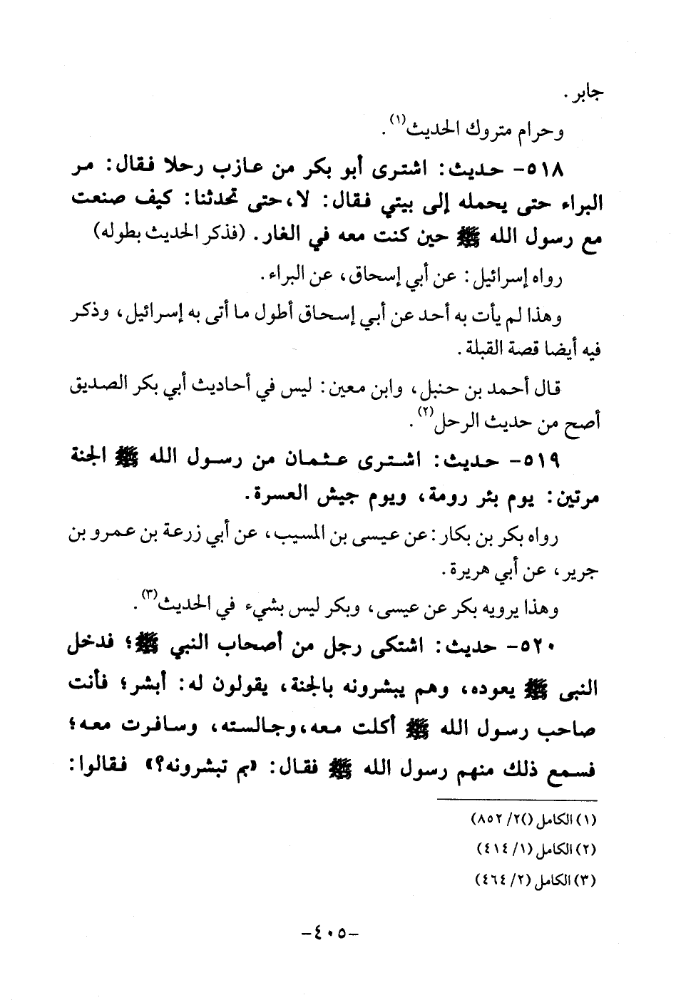 518 - حَدِيث: اشْترى أَبُو بكر من عَازِب رحلا فَقَالَ: مر الْبَراء حَتَّى يحملهُ إِلَى بَيْتِي فَقَالَ: لَا، حَتَّى تحدثنا: كَيفَ صنعت مَعَ رَسُول الله - صلى الله عَلَيْهِ وَسلم - حِين كنت مَعَه فِي النَّار. (فذكرالحديث بِطُولِهِ) . رَوَاهُ إِسْرَائِيل: عَن أبي إِسْحَاق، عَن الْبَراء. وَهَذَا لم يَأْتِ بِهِ أحد عَن أبي إِسْحَاق أطول مَا أَتَى بِهِ إِسْرَائِيل، وَذكر فِيهِ أَيْضا قصَّة الْقبْلَة. قَالَ أَحْمد بن حَنْبَل، وَابْن معِين: لَيْسَ فِي أَحَادِيث أبي بكر الصّديق أصح من حَدِيث الرحل.