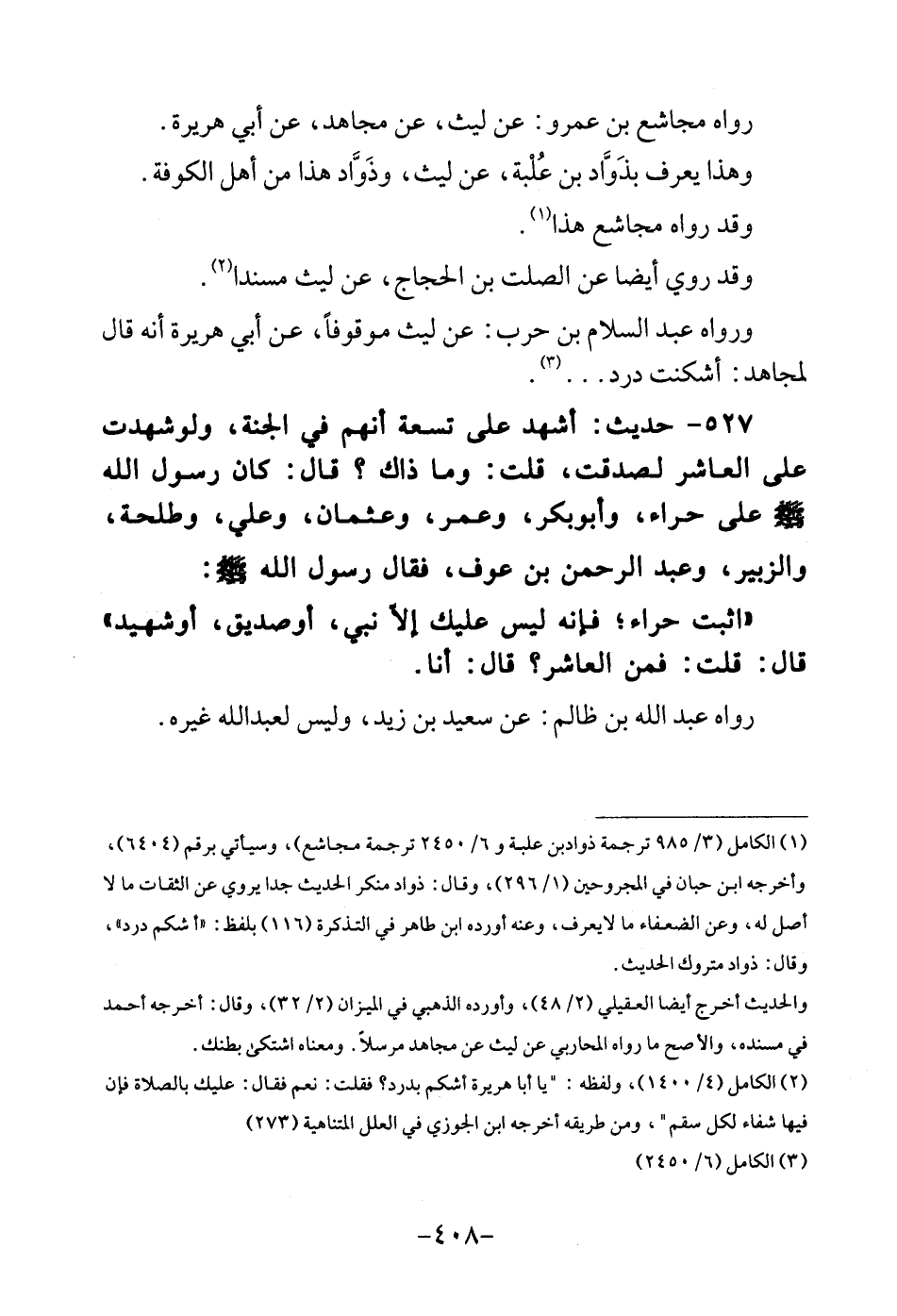 527 - حَدِيث: أشهد على تِسْعَة أَنهم فِي الْجنَّة، ولوشهدت على الْعَاشِر لصدقت، قلت: وَمَا ذَاك؟ قَالَ: كَانَ رَسُول الله - صلى الله عَلَيْهِ وَسلم - على حراء، وأبوبكر، وَعمر، وَعُثْمَان، وَعلي، وَطَلْحَة، رالزبير، وَعبد الرَّحْمَن بن عَوْف، فَقَالَ رَسُول الله - صلى الله عَلَيْهِ وَسلم -: " اثْبتْ حراء؛ فَإِنَّهُ لَيْسَ عَلَيْك الاّ نَبِي، أَو صديق، أوشهيد " قَالَ: قَالَت: فَمن الْعَاشِر؟ قَالَ: أَنا. رَوَاهُ عبد الله بن ظَالِم: عَن سعيد بن زيد، وَلَيْسَ لعبد الله غَيره.