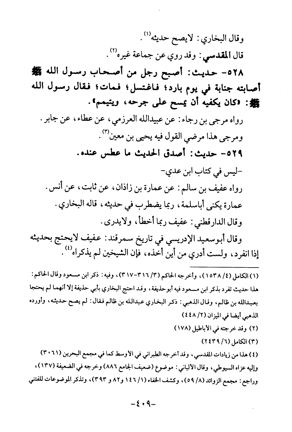 528 - حَدِيث: أصبح رجل من أَصْحَاب رَسُول الله - صلى الله عَلَيْهِ وَسلم - أَصَابَته جَنَابَة فِي يَوْم بَارِد؛ فاغتسل؛ فَمَاتَ؛ فَقَالَ رَسُول الله - صلى الله عَلَيْهِ وَسلم -: " كَانَ يَكْفِيهِ أَن يمسح على جرحه، وَيتَيَمَّم ". رَوَاهُ مرجى بن رَجَاء: عَن عبيد الله الْعَرْزَمِي، عَن عَطاء، عَن جَابر. ومرجى هَذَا مرضِي القَوْل فِيهِ يحيى بن معِين.