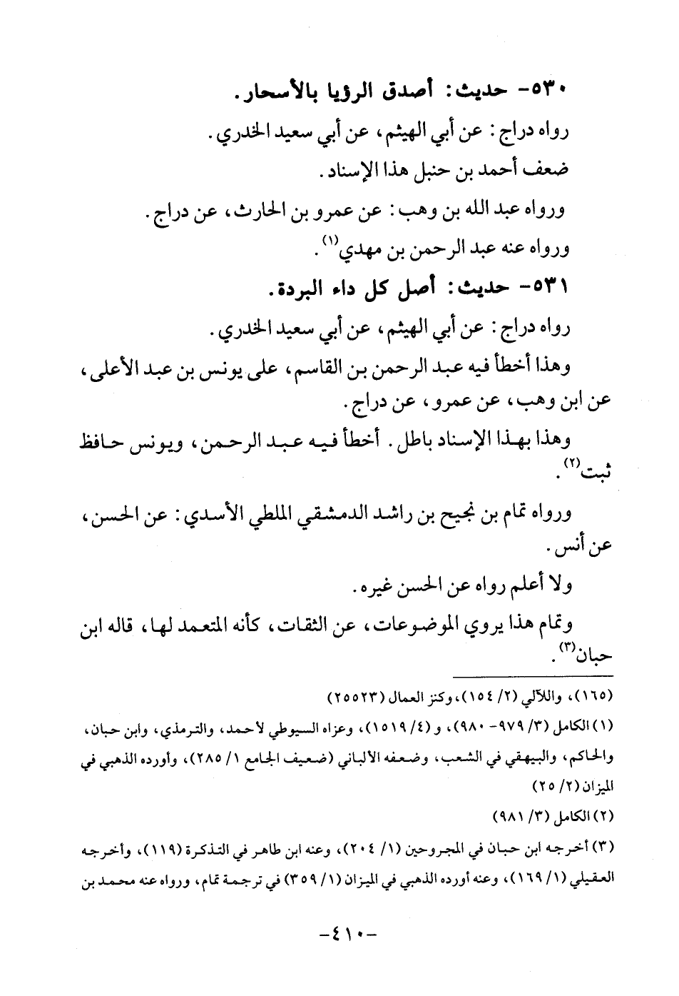 530 - حَدِيث: أصدق الرُّؤْيَا بالأسحار. رَوَاهُ دراج: عَن أبي الْهَيْثَم، عَن أبي سعيد الْخُدْرِيّ. ضعف أَحْمد بن حَنْبَل هَذَا الْإِسْنَاد. وَرَوَاهُ عبد الله بن وهب: عَن عَمْرو بن الْحَارِث، عَن دراج. وَرَوَاهُ عَنهُ عبد الرَّحْمَن بن مهْدي.
