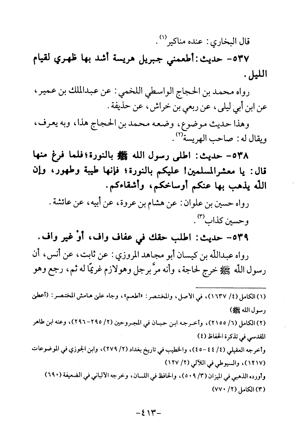 537 - حَدِيث: أَطْعمنِي جِبْرِيل هريسة أَشد بهَا ظَهْري لقِيَام اللَّيْل. رَوَاهُ مُحَمَّد بن الْحجَّاج الوَاسِطِيّ اللَّخْمِيّ: عَن عبد الملك بن عُمَيْر، عَن ابْن أبي ليلى، عَن ربعي بن خرَاش، عَن حُذَيْفَة. وَهَذَا حَدِيث مَوْضُوع، وَضعه مُحَمَّد بن الْحجَّاج هَذَا، وَبِه يعرف، وَيُقَال لَهُ: صَاحب الهريسة.