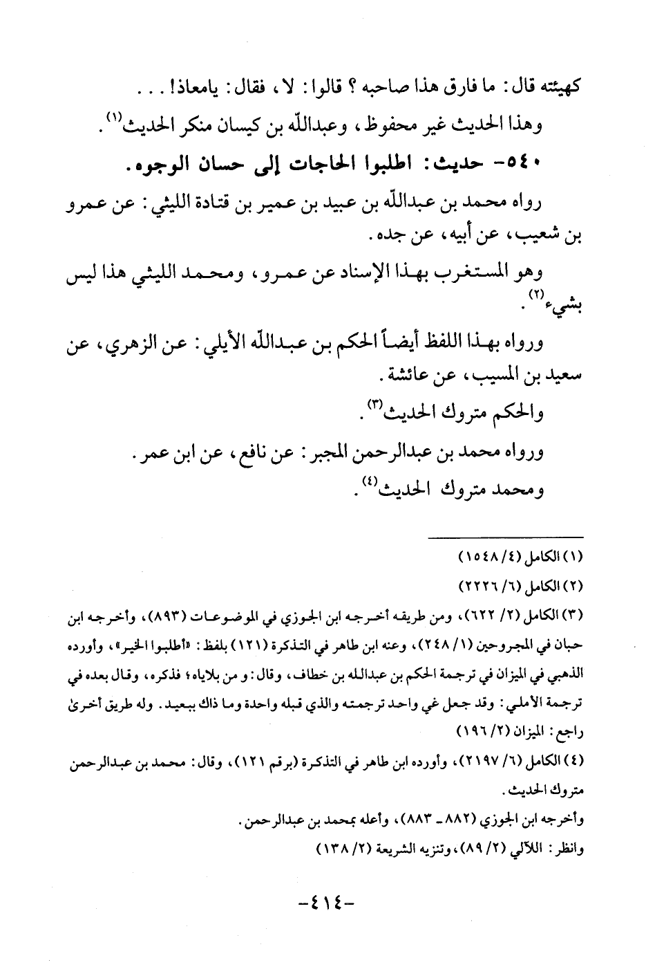 540 - حَدِيث: اطْلُبُوا الْحَاجَات إِلَى حسان الْوُجُوه. رَوَاهُ مُحَمَّد بن عبد الله بن عبيد بن عُمَيْر بن قَتَادَة اللَّيْثِيّ: عَن عَمْرو بن شُعَيْب، عَن أَبِيه، عَن جده. وَهُوَ المستغرب بِهَذَا الْإِسْنَاد عَن عَمْرو، وَمُحَمّد اللَّيْثِيّ هَذَا لَيْسَ بشىء. وَرَوَاهُ بِهَذَا اللَّفْظ أَيْضا الحكم بن عبد الله الْأَيْلِي: عَن الزُّهْرِيّ، عَن سعيد بن الْمسيب، عَن عَائِشَة. وَالْحكم مَتْرُوك الحَدِيث. وَرَوَاهُ مُحَمَّد بن عبد الرحمن الْمُجبر: عَن نَافِع، عَن ابْن عمر. وَمُحَمّد مَتْرُوك الحَدِيث.