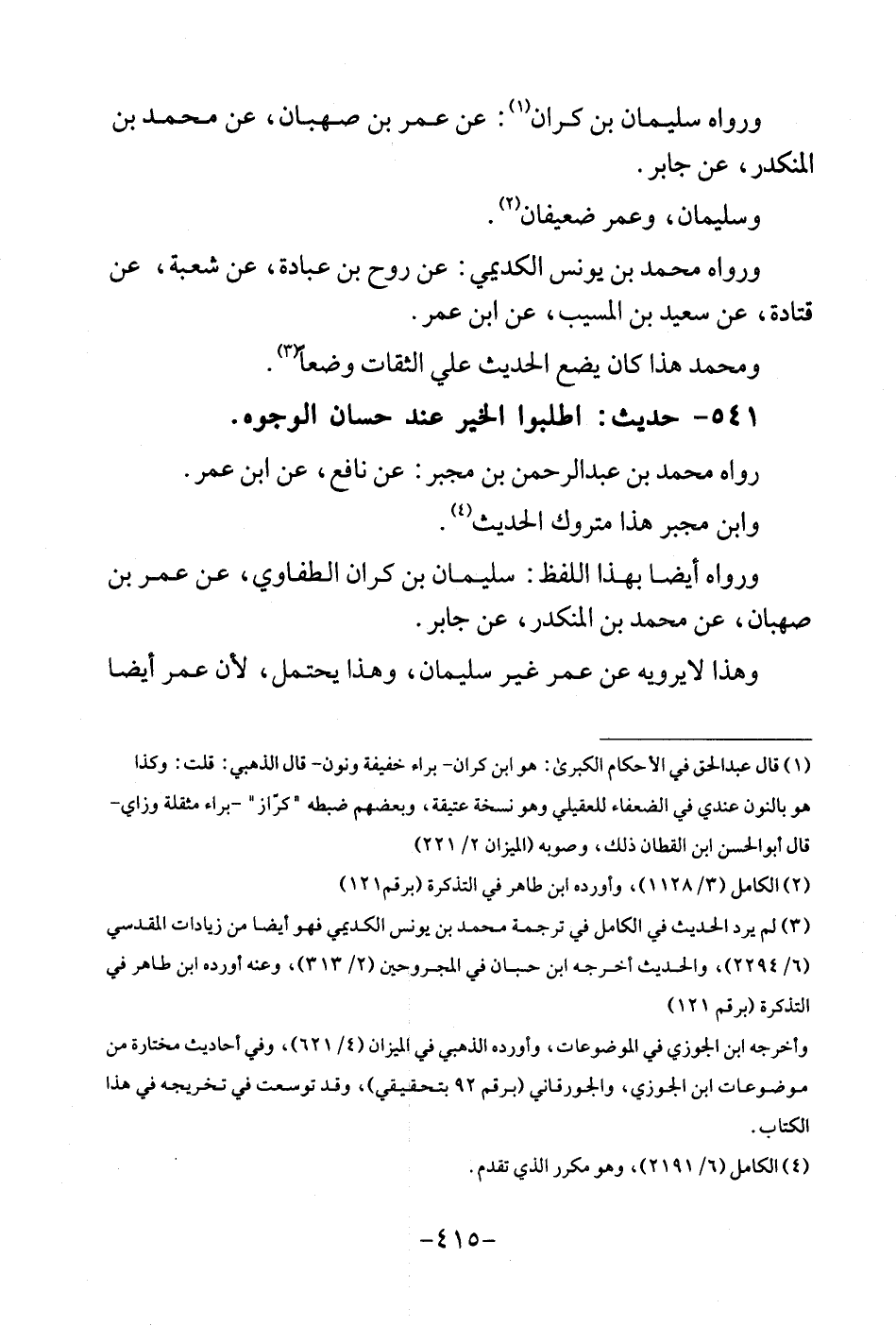 541 - حَدِيث: اطْلُبُوا الْخَبَر عِنْد حسان الْوُجُوه. رَوَاهُ مُحَمَّد بن عبد الرحمن بن مجبر: عَن نَافِع، عَن ابْن عمر. وَابْن مجبر هَذَا مَتْرُوك الحَدِيث. وَرَوَاهُ أَيْضا بِهَذَا اللَّفْظ: سُلَيْمَان بن كران الطفَاوِي، عَن عمر بن صهْبَان، عَن مُحَمَّد بن الْمُنْكَدر، عَن جَابر. وَهَذَا لايرويه عَن عمر غير سُلَيْمَان، وَهَذَا يحْتَمل، لِأَن عمر أَيْضا