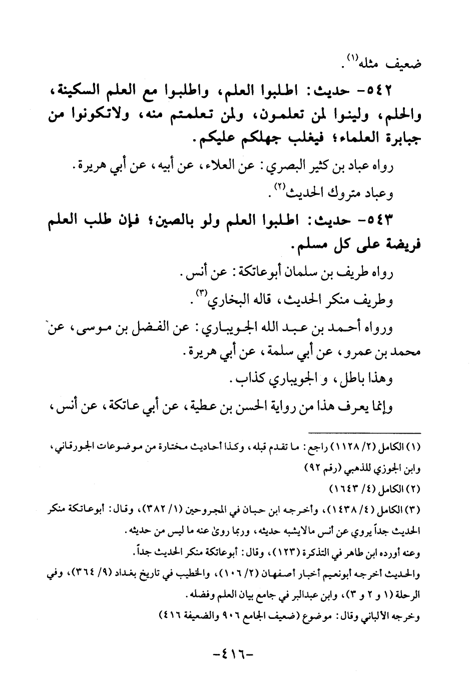 542 - حَدِيث: اطْلُبُوا الْعلم، واطلبوا مَعَ الْعلم السكينَة، والحلم، ولينوا لمن تعلمُونَ، وَلمن تعلمتم مِنْهُ، ولاتكونوا من جبابرة الْعلمَاء؛ فيغلب جهلكم عَلَيْكُم. رَوَاهُ عباد بن كثير الْبَصْرِيّ: عَن الْعَلَاء، عَن أَبِيه، عَن أبي هُرَيْرَة. وَعباد مَتْرُوك الحَدِيث.