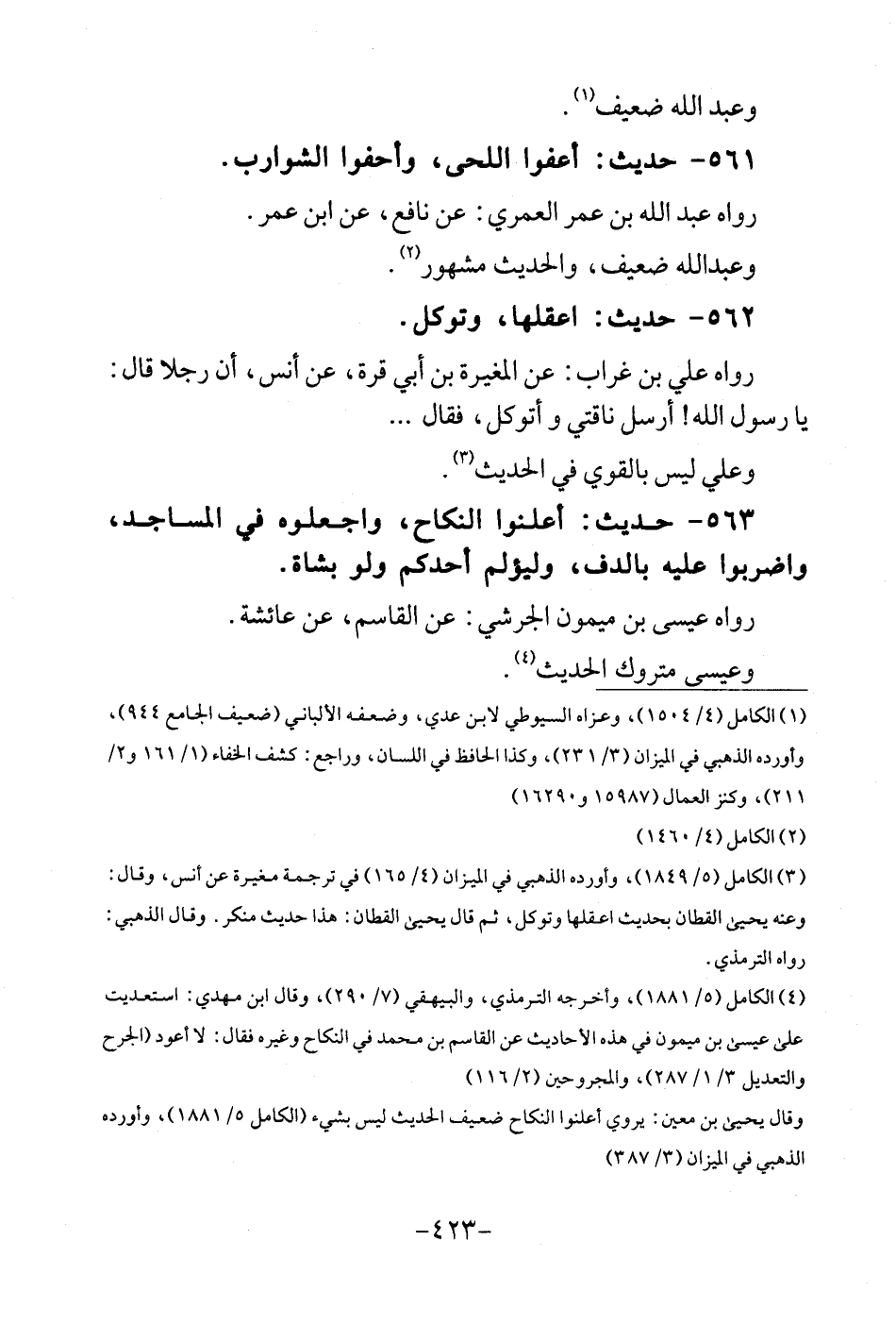 561 - حَدِيث: اأعفوا اللحى، وأحفوا الشَّوَارِب. رَوَاهُ عبد الله بن عمر الْعمريّ، عَن نَافِع، عَن ابْن عمر. وَعبد الله ضَعِيف، والْحَدِيث مَشْهُور.