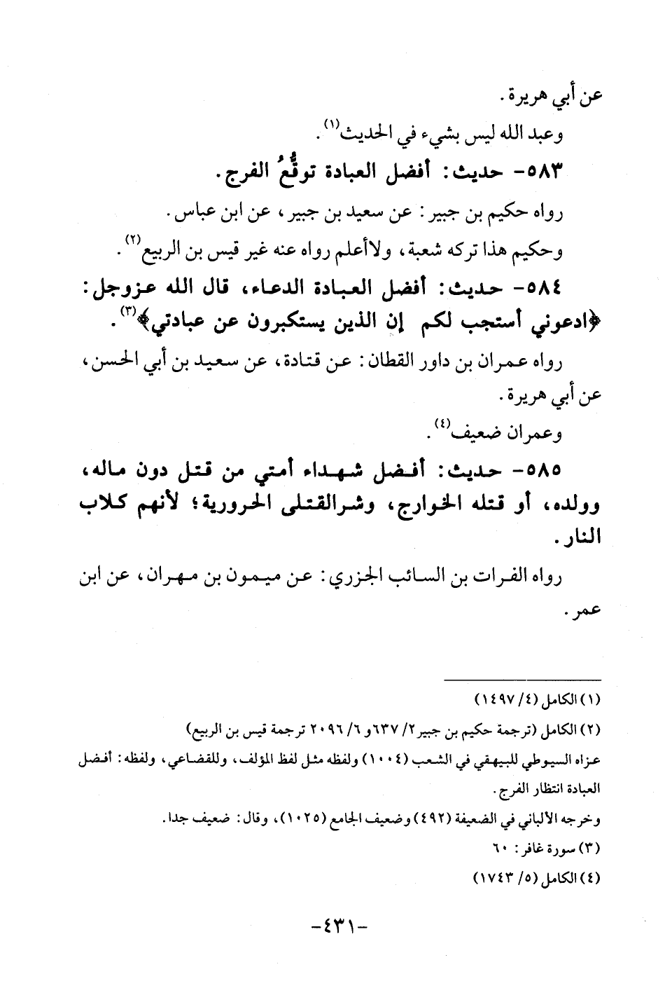 583 - حَدِيث: أفضل الْعِبَادَة توقُّعُ الْفرج. رَوَاهُ حَكِيم بن جُبَير: عَن سعيد بن جُبَير، عَن ابْن عَبَّاس. وَحَكِيم هَذَا تَركه شُعْبَة، وَلَا أعلم رَوَاهُ عَنهُ غير قيس بن الرّبيع. 584 - حَدِيث: أفضل الْعِبَادَة الدُّعَاء، فال الله عزوجل: (ادْعُونِي أَسْتَجِب لكم ان الَّذين يستكبررن عَن عبادني (. رَوَاهُ عمرَان بن دَاور الْقطَّان: عَن قَتَادَة، عَن سعيد بن أبي الْحسن، عَن أبي هُرَيْرَة. وَعمْرَان ضَعِيف.