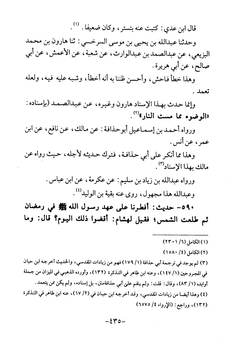 قَالَ ابْن عدي: كتبت عَنهُ بتستر، وَكَانَ ضَعِيفا. وَحدثنَا عبد الله بن يحيى بن مُوسَى السَّرخسِيّ: ثَنَا هَارُون بن مُحَمَّد البزيعي، عَن عبد الصمد بن عبد الوارث، عَن شُعْبَة، عَن الْأَعْمَش، عَن أبي صَالح، عَن أبي هُرَيْرَة. وَهَذَا خطأ فَاحش، وَأحسن ظننا بِهِ أَنه أَخطَأ، وَشبه عَلَيْهِ فِيهِ، وَلَعَلَّه تعمد. وَإِنَّمَا حدث بِهَذَا الْإِسْنَاد هَارُون وَغَيره، عَن عبد الصمد (بِإِسْنَادِهِ: " الْوضُوء مِمَّا مست النَّار ". وَرَوَاهُ أَحْمد بن إِسْمَاعِيل أبوحذافة: عَن مَالك، عَن نَافِع، عَن ابْن عمر، عَن أنس. وَهَذَا مِمَّا أنكر على أبي حذافة، فَترك حَدِيثه لأَجله، حَيْثُ رَوَاهُ عَن مَالك بِهَذَا الْإِسْنَاد. وَرَوَاهُ عبد الله بن زِيَاد بن سليم: عَن عِكْرِمَة، عَن ابْن عَبَّاس. وعبد الله هَذَا مجهوك، روى عَنهُ بَقِيَّة بن الْوَلِيد.