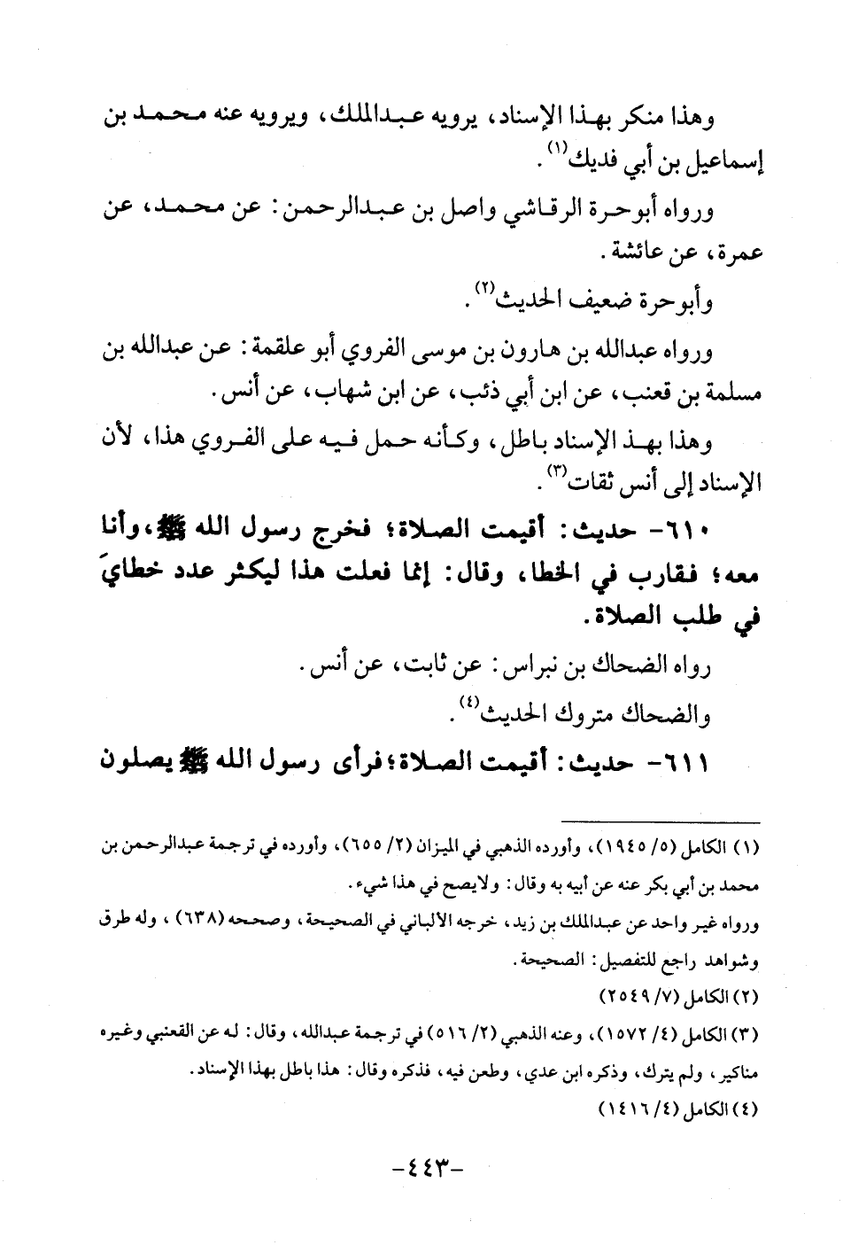 610 - حَدِيث: أُقِيمَت الصَّلَاة؛ فَخرج رَسُول الله - صلى الله عَلَيْهِ وَسلم -، وَأَنا مَعَه؛ فقارب فِي الخطا، وَقَالَ: إِنَّمَا فعلت هَذَا ليكْثر عدد خطايَ فِي طلب الصَّلَاة. رَوَاهُ الضَّحَّاك بن نبراس: عَن ثَابت، عَن أنس. وَالضَّحَّاك مَتْرُوك الحَدِيث.