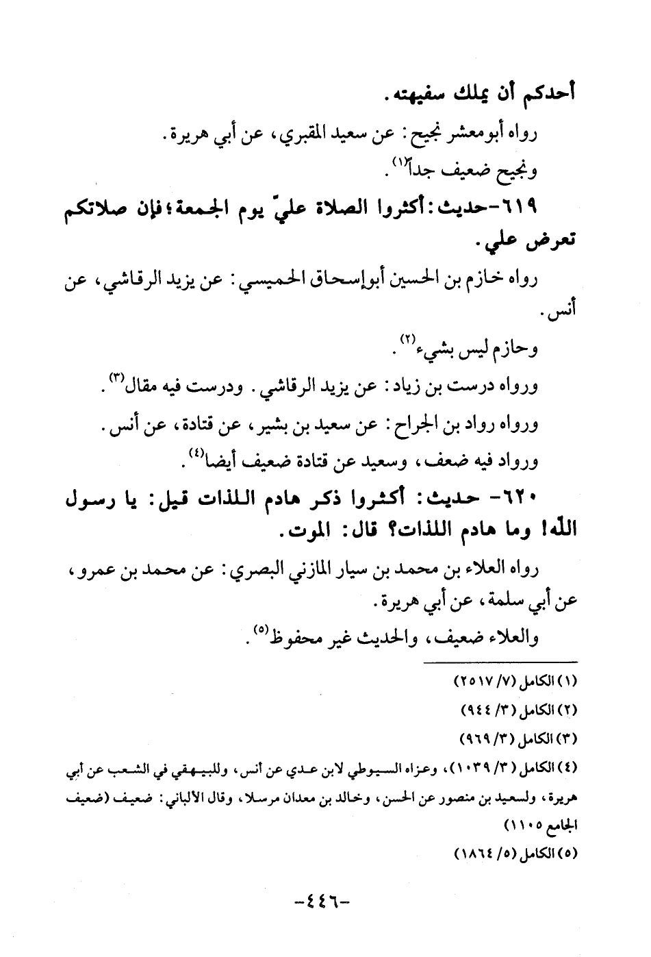 619 - حَدِيث: أَكْثرُوا الصَّلَاة عليّ يَوْم الْجُمُعَة؛ فَإِن صَلَاتكُمْ تعرض عَليّ. رَوَاهُ خازم بن الْحُسَيْن أَبُو إِسْحَاق الحميسي: عَن يزِيد الرقاشِي، عَن أنس. وحازم لَيْسَ بِشَيْء. وَرَوَاهُ درست بن زِيَاد: عَن يزِيد الرقاشِي. ودرست فِيهِ مقَال. وَرَوَاهُ رواد بن الْجراح: عَن سعيد بن بشير، عَن قَتَادَة، عَن انس. ورواد فِيهِ ضعف، وَسَعِيد عَن قَتَادَة ضَعِيف أَيْضا.