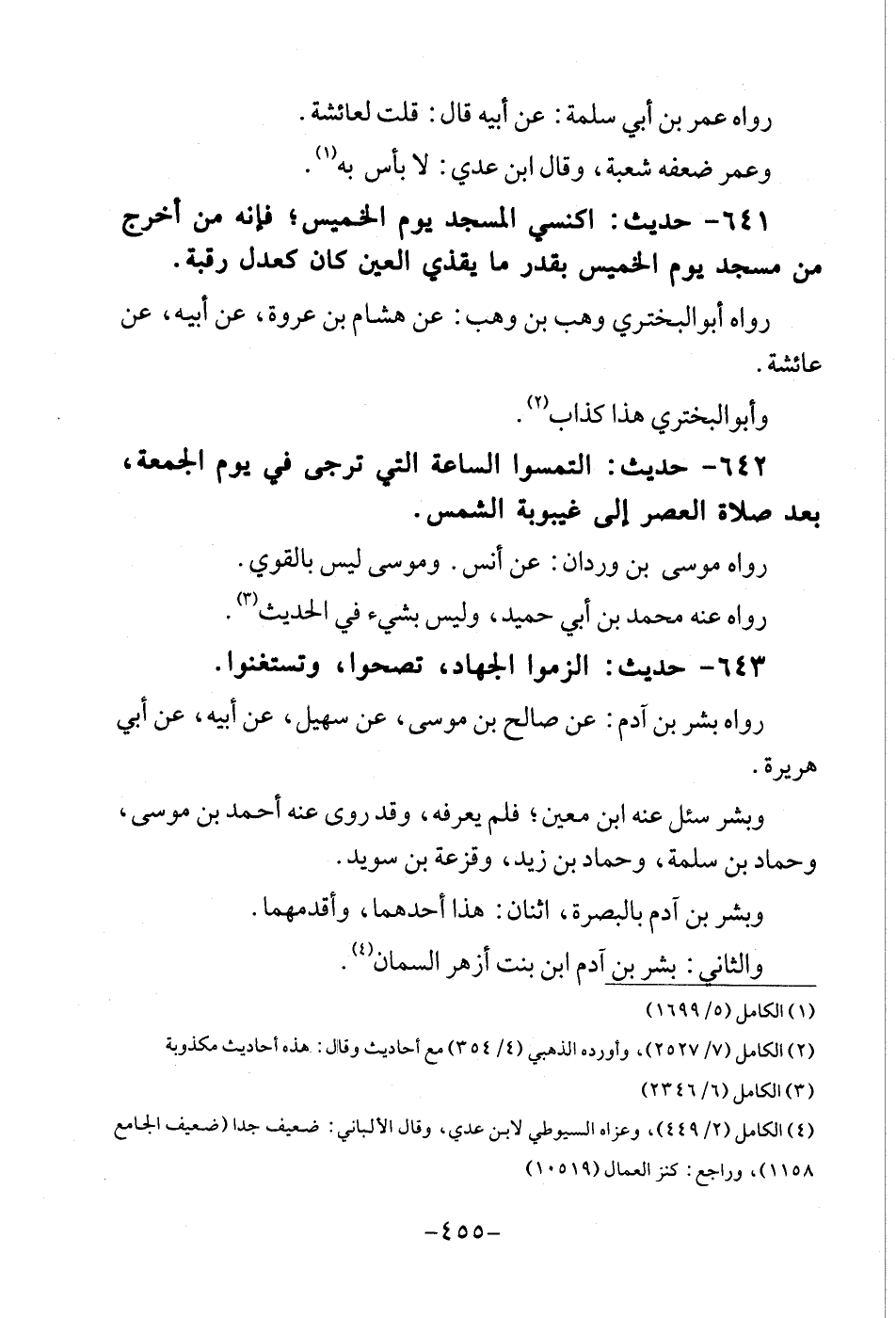 643 - حَدِيث: الزموا الْجِهَاد، تصحوا، وتستغنوا. رَوَاهُ بشر بن ادم: عَن صَالح بن مُوسَى، عَن سُهَيْل، عَن أَبِيه، عَن أبي هُرَيْرَة. وَبشر سُئِلَ عَنهُ ابْن معِين، فَلم يعرفهُ، وَقد روى عَنهُ أَحْمد بن مُوسَى، وَحَمَّاد بن سَلمَة، وَحَمَّاد بن زيد، وقزعة بن سُوَيْد. وَبشر بن آدم بِالْبَصْرَةِ، اثْنَان: هَذَا أَحدهمَا، وأقدمهما. والثانى: بشر بن آدم ابْن بنت أَزْهَر السمان.