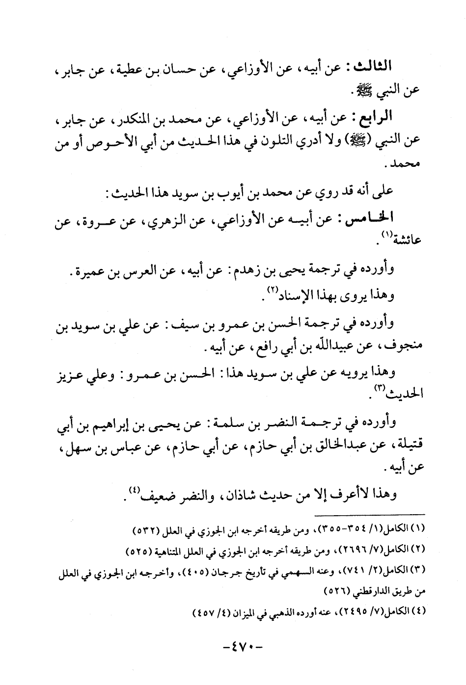 الثَّالِث: عَن أَبِيه، عَن الْأَوْزَاعِيّ، عَن حسان بن عَطِيَّة، عَن جَابر، عَن النَّبِي - صلى الله عَلَيْهِ وَسلم -. الرَّابِع: عَن أَبِيه، عَن الْأَوْزَاعِيّ، عَن مُحَمَّد بن الْمُنْكَدر، عَن جَابر، عَن النَّبِي - صلى الله عَلَيْهِ وَسلم - وَلَا أَدْرِي التلون فِي هَذَا الحَدِيث من أبي الْأَحْوَص أَو من مُحَمَّد. على أَنه قد رُوِيَ عَن مُحَمَّد بن أَيُّوب بن سُوَيْد هَذَا الحَدِيث: الْخَامِس: عَن أَبِيه عَن الْأَوْزَاعِيّ، عَن الزُّهْرِيّ، عَن عُرْوَة، عَن عَائِشَة. وَأوردهُ فِي تَرْجَمَة يحيى بن زَهْدَم: عَن أَبِيه، عَن الْعرس بن عميرَة. وَهَذَا يرْوى بِهَذَا الْإِسْنَاد. وَأوردهُ فِي تَرْجَمَة الْحسن بن عَمْرو بن سيف: عَن عَليّ بن سُوَيْد بن منجوف، عَن عبيد الله بن أبي رَافع، عَن أَبِيه. وَهَذَا يرويهِ عَن عَليّ بن سُوَيْد هَذَا: الْحسن بن عَمْرو: وَعلي عَزِيز الحَدِيث. وَأوردهُ فِي تَرْجَمَة النَّضر بن سَلمَة: عَن يحيى بن إِبْرَاهِيم بن أبي قتيلة، عَن عبد الخالق بن أبي حَازِم، عَن أبي حَازِم، عَن عَبَّاس بن سهل، عَن أَبِيه. وَهَذَا لَا أعرف إِلَّا من حَدِيث شَاذان، وَالنضْر ضَعِيف.