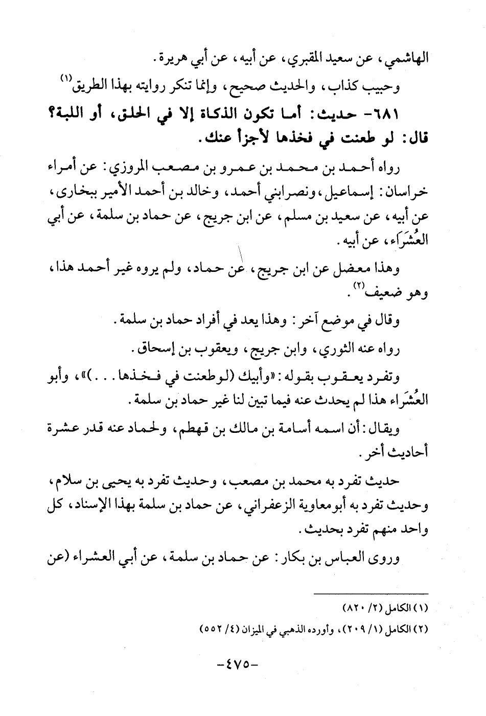 681 - حَدِيث: أما تكون الذَّكَاة الا فِي الْحلق، أَو اللبة؟ قَالَ: لَو طعنت فِي فَخذهَا لأجزأ عَنْك. رَوَاهُ أَحْمد بن مُحَمَّد بن عَمْرو بن مُصعب الْمروزِي: عَن أُمَرَاء خُرَاسَان: إِسْمَاعِيل، ونصرابني أَحْمد، وخَالِد بن أَحْمد الْأَمِير ببخارى، عَن أَبِيه، عَن سعيد بن مُسلم، عَن ابْن جريج، عَن حَمَّاد بن سَلمَة، عَن أبي العشراء، عَن أَبِيه. وَهَذَا معضل عَن ابْن جريج، عَن حَمَّاد، وَلم يروه غير أَحْمد هَذَا، وَهُوَ ضَعِيف. وَقَالَ فِي مَوضِع آخر: وَهَذَا يعد فِي أَفْرَاد حَمَّاد بن سَلمَة. رَوَاهُ عَنهُ الثَّوْريّ، وَابْن جريج، وَيَعْقُوب بن إِسْحَاق. وَتفرد يَعْقُوب بقوله: " وَأَبِيك (لوطعنت فِي فَخذهَا) "، وَأَبُو العشراء هَذَا لم يحدث عَنهُ فِيمَا تبين لنا غيرحماد بن سَلمَة. وَيُقَال: أَن اسْمه أُسَامَة بن مَالك بن قهطم، ولحماد عَنهُ قدر عشرَة أَحَادِيث أخر. حَدِيث تفرد بِهِ مُحَمَّد بن مُصعب، وَحَدِيث تفرد بِهِ يحيى بن سَلام، وَحَدِيث تفرد بِهِ أبومعاوية الزَّعْفَرَانِي، عَن حَمَّاد بن سَلمَة بِهَذَا الْإِسْنَاد، كل وَاحِد مِنْهُم تفرد بِحَدِيث. وروى الْعَبَّاس بن بكار: عَن حَمَّاد بن سَلمَة، عَن أبي العشراء (عَن