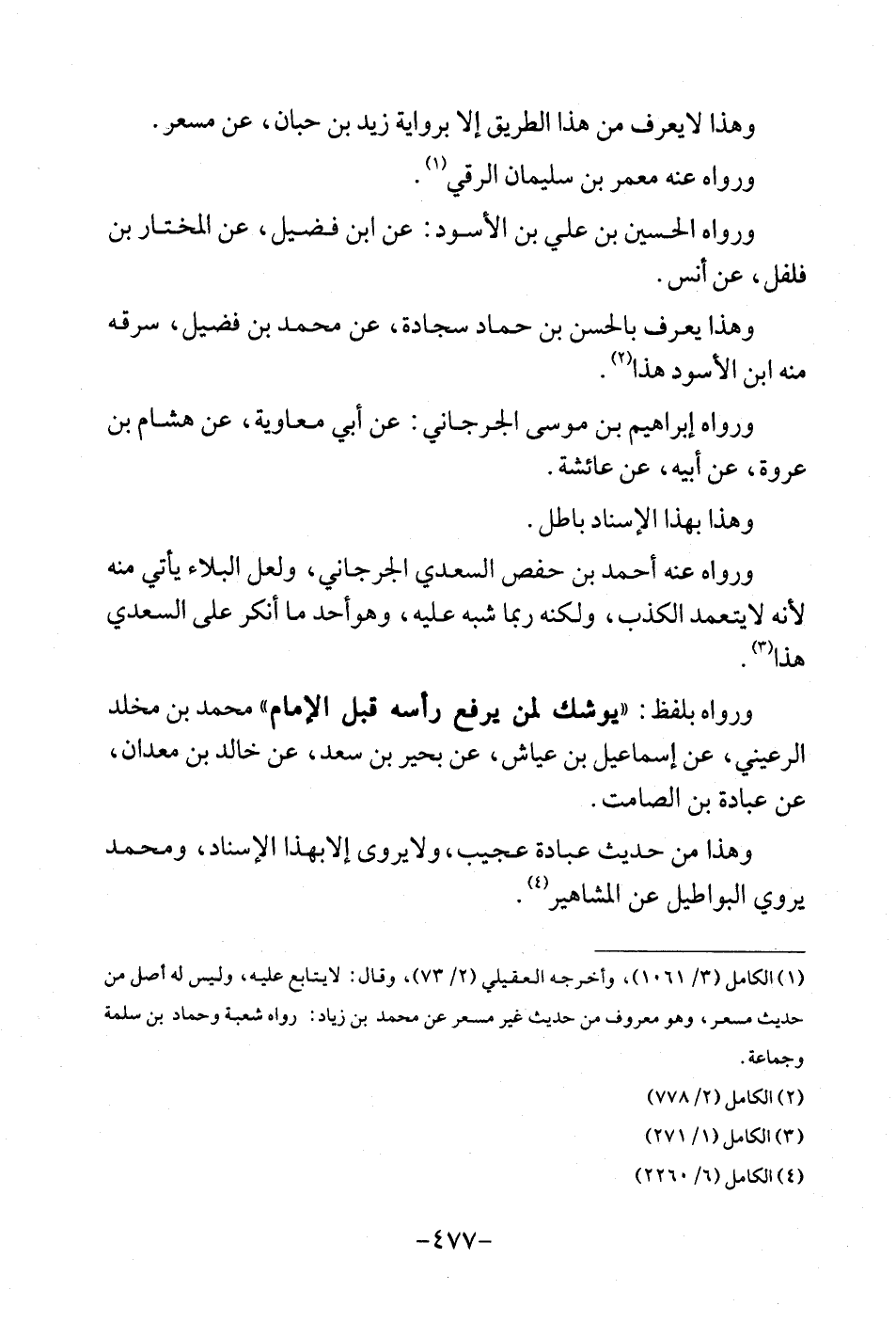 وَهَذَا لَا يعرف من هَذَا الطَّرِيق إِلَّا بِرِوَايَة زيد بن حبَان، عَن مسعر. وَرَوَاهُ عَنهُ معمر بن سُلَيْمَان الرقي. وَرَوَاهُ الْحُسَيْن بن على بن الْأسود: عَن ابْن فُضَيْل، عَن الْمُخْتَار بن فلفل، عَن أنس. وَهَذَا يعرف بالْحسنِ بن حَمَّاد سجادة، عَن مُحَمَّد بن فُضَيْل، سَرقه مِنْهُ ابْن الْأسود هَذَا. وَرَوَاهُ إِبْرَاهِيم بن مُوسَى الْجِرْجَانِيّ: عَن أبي مُعَاوِيَة، عَن هِشَام بن عُرْوَة، عَن أَبِيه، عَن عَائِشَة. وَهَذَا بِهَذَا الْإِسْنَاد بَاطِل. وَرَوَاهُ عَنهُ أَحْمد بن حَفْص السَّعْدِيّ الْجِرْجَانِيّ، وَلَعَلَّ الْبلَاء يَأْتِي مِنْهُ لِأَنَّهُ لَا يتَعَمَّد الْكَذِب، وَلكنه رُبمَا شبه عَلَيْهِ، وَهُوَ أحد مَا أنكر على السَّعْدِيّ هَذَا. وَرَوَاهُ بِلَفْظ. " يهوشك لمن يرفع رَأسه قبل الامام " مُحَمَّد بن مخلد الرعيني، عَن إِسْمَاعِيل بن عَيَّاش، عَن بحير بن سعد، عَن خَالِد بن معدان، عَن عبَادَة بن الصَّامِت. وَهَذَا من حَدِيث عبَادَة عَجِيب، وَلَا يرْوى إِلَّا بِهَذَا الْإِسْنَاد، وَمُحَمّد يروي البواطيل عَن الْمَشَاهِير. .