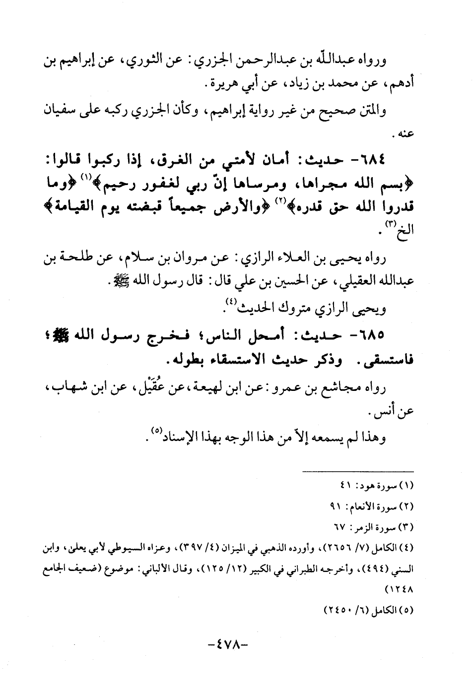 684 - حَدِيث: أَمَان لأمتي من الْغَرق، إِذا ركبُوا قَالُوا: (بِسم الله مجْراهَا، وَمرْسَاهَا انّ رَبِّي لغَفُور رَحِيم ((وَمَا قدرُوا الله حق قدره ((وَالْأَرْض جَمِيعًا قَبضته يَوْم الْقِيَامَة (الخ. رَوَاهُ يحيى بن الْعَلَاء الرَّازِيّ: عَن مَرْوَان بن سَلام، عَن طَلْحَة بن عبد الله الْعقيلِيّ، عَن الْحُسَيْن بن عَليّ قَالَ: قَالَ رَسُول الله - صلى الله عَلَيْهِ وَسلم -. وَيحيى الرَّازِيّ مَتْرُوك الحَدِيث.
