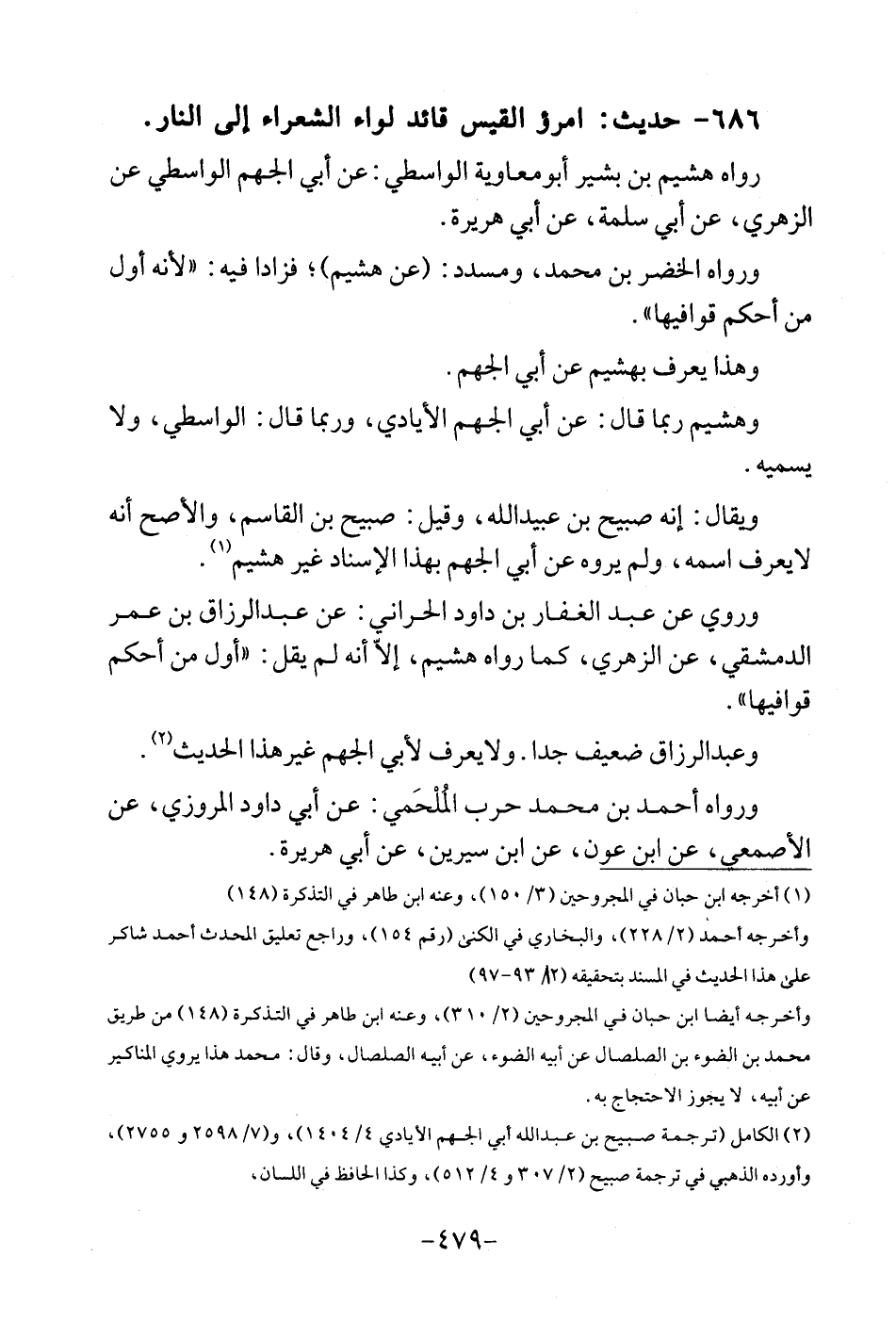 686 - حديت: امْرُؤ الْقَيْس قَائِد لِوَاء الشُّعَرَاء إِلَى النَّار. رَوَاهُ هشيم بن بشير أَبُو مُعَاوِيَة الوَاسِطِيّ: عَن أبي الجهم الوَاسِطِيّ عَن الزُّهْرِيّ، عَن أبي سَلمَة، عَن أبي هُرَيْرَة. وَرَوَاهُ الْخضر بن مُحَمَّد، ومسدد: (عَن هشيم) ؛ فزادا فِيهِ: " لِأَنَّهُ أول من أحكم قوافيها ". وَهَذَا يعرف بهشيم عَن أبي الجهم. وهشيم رُبمَا قَالَ: عَن أبي الجهم الأيادي، وَرُبمَا قَالَ: الوَاسِطِيّ، وَلَا يُسَمِّيه. وَيُقَال: إِنَّه صبيح بن عبيد الله، وَقيل: صبيح بن الْقَاسِم، وَالأَصَح أَنه لايعرف اسْمه، وَلم يروه عَن أبي الجهم بِهَذَا الْإِسْنَاد غير هشيم. وَرُوِيَ عَن عبد الْغفار بن دَاوُد الْحَرَّانِي: عَن عبد الرزاق بن عمر الدِّمَشْقِي، عَن الزُّهْرِيّ، كَمَا رَوَاهُ هشيم، إِلَّا أَنه لم يقل: " أول من أحكم قوافيها ". وعبد الرزاق ضَعِيف جدا. ولايعرف لأبي الجهم غيرهذا الحَدِيث. وَرَوَاهُ أَحْمد بن مُحَمَّد حَرْب المُلْحَمي: عَن أبي دَاوُد الْمروزِي، عَن الْأَصْمَعِي، عَن ابْن عون، عَن ابْن سِيرِين، عَن أبي هُرَيْرَة.