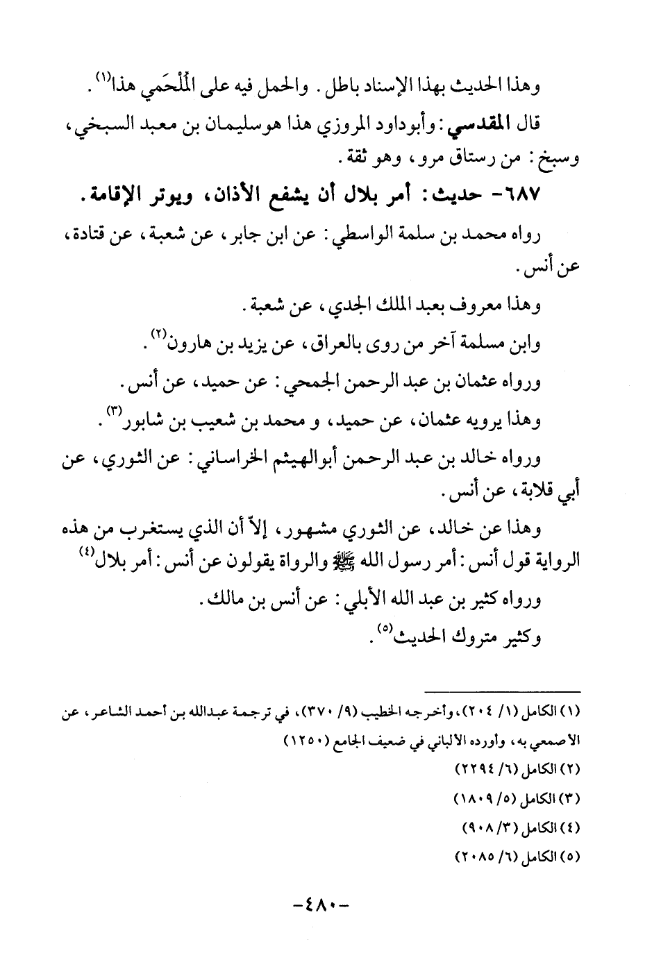 687 - حَدِيث: أَمر بِلَال أَن يشفع الْأَذَان، ويوتر الْإِقَامَة. رَوَاهُ مُحَمَّد بن سَلمَة الوَاسِطِيّ: عَن ابْن جَابر، عَن شُعْبَة، عَن قَتَادَة، عَن أنس. وَهَذَا مَعْرُوف بِعَبْد الْملك الجدي، عَن شُعْبَة. وَابْن مسلمة اخر من روى بالعراق، عَن يزِيد بن هَارُون. وَرَوَاهُ عُثْمَان بن عبد الرَّحْمَن الجُمَحِي: عَن حميد، عَن أنس. وَهَذَا يرويهِ عُثْمَان، عَن حميد، وَمُحَمّد بن شُعَيْب بن شَابُور. وَرَوَاهُ خَالِد بن عبد الرَّحْمَن أَبُو الْهَيْثَم الْخُرَاسَانِي: عَن الثَّوْريّ، عَن أبي قلَابَة، عَن أنس. وَهَذَا عَن خَالِد، عَن الثَّوْريّ مَشْهُور، إلاّ أَن الَّذِي يستغرب من هَذِه الرِّوَايَة قَول أنس: أَمر رَسُول الله - صلى الله عَلَيْهِ وَسلم - والرواة يَقُولُونَ عَن أنس: أَمر بِلَال. وَرَوَاهُ كثير بن عبد الله الأبلي: عَن أنس بن مَالك. وَكثير مَتْرُوك الحَدِيث.