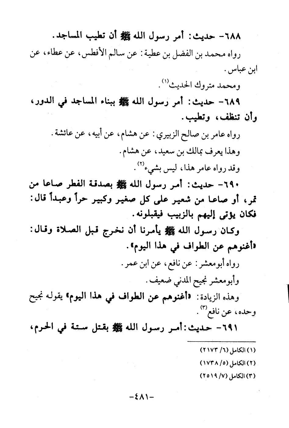 688 - حَدِيث: أَمر رَسُول الله - صلى الله عَلَيْهِ وَسلم - أَن تطيب الْمَسَاجِد. رَوَاهُ مُحَمَّد بن الْفضل بن عَطِيَّة: عَن سَالم الْأَفْطَس، عَن عَطاء، عَن ابْن عَبَّاس. وَمُحَمّد مَتْرُوك الحَدِيث.