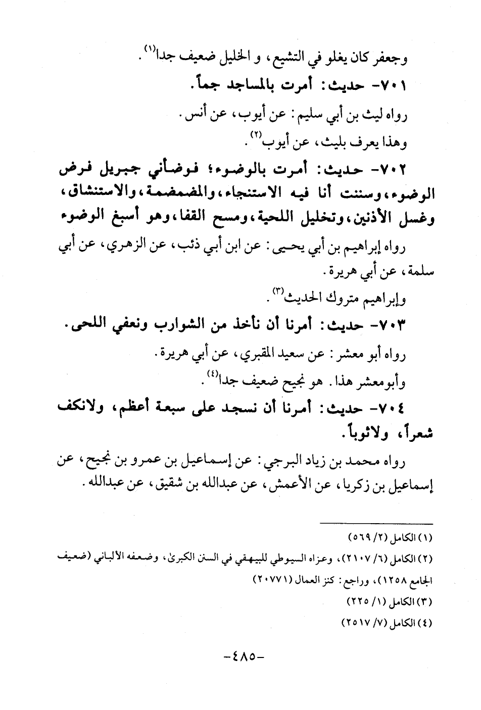 702 - حَدِيث: أمرت بِالْوضُوءِ؛ فوضأني جِبْرِيل فرض الْوضُوء، وسننت أَنا فبه الِاسْتِنْجَاء، والمضمضة، وَالِاسْتِنْشَاق، وَغسل الْأُذُنَيْنِ، وتخليل اللِّحْيَة، وَمسح الْقَفَا، وَهُوَ أَسْبغ الْوضُوء. رَوَاهُ إِبْرَاهِيم بن أبي يحيى: عَن ابْن أبي ذِئْب، عَن الزُّهْرِيّ، عَن أبي سَلمَة، عَن أبي هُرَيْرَة. وَإِبْرَاهِيم مَتْرُوك الحَدِيث.