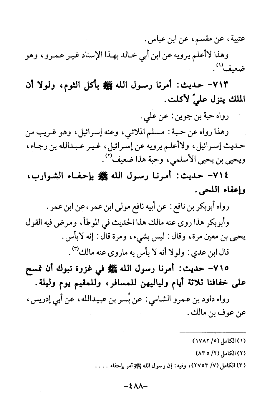 714 - حَدِيث: أمرنَا رَسُول الله - صلى الله عَلَيْهِ وَسلم - بإحفاء الشَّوَارِب، واعفاء اللحى. رَوَاهُ أبوبكر بن نَافِع: عَن أَبِيه نَافِع مولى ابْن عمر، عَن ابْن عمر. وأبوبكر هَذَا روى عَنهُ مَالك هَذَا الحَدِيث فِي الْمُوَطَّأ، وَمرض فِيهِ القَوْل يحيى بن معِين مرّة، وَقَالَ: لَيْسَ بِشَيْء، وَمرَّة قَالَ: إِنَّه لابأس. قَالَ ابْن عدي: وَلَوْلَا أَنه لَا بَأْس بِهِ ماروى عَنهُ مَالك.
