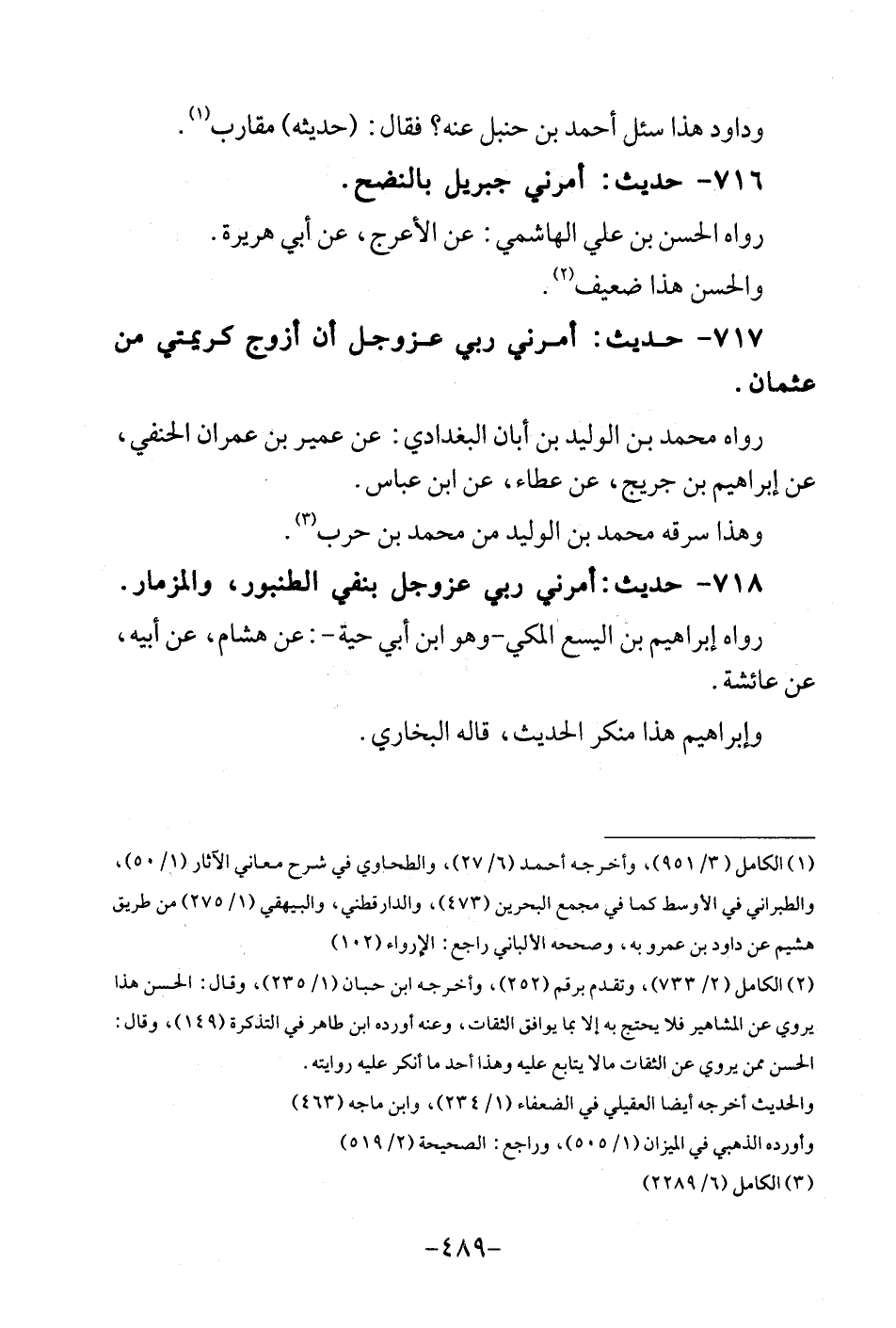 717 - حَدِيث: أَمرنِي رَبِّي عزوجل أَن أزوج كَرِيمَتي من عُثْمَان. رَوَاهُ مُحَمَّد بن الْوَلِيد بن أبان الْبَغْدَادِيّ: عَن عُمَيْر بن عمرَان الْحَنَفِيّ، عَن إِبْرَاهِيم بن جريج، عَن عَطاء، عَن ابْن عَبَّاس. وَهَذَا سَرقه مُحَمَّد بن الْوَلِيد من مُحَمَّد بن حَرْب.