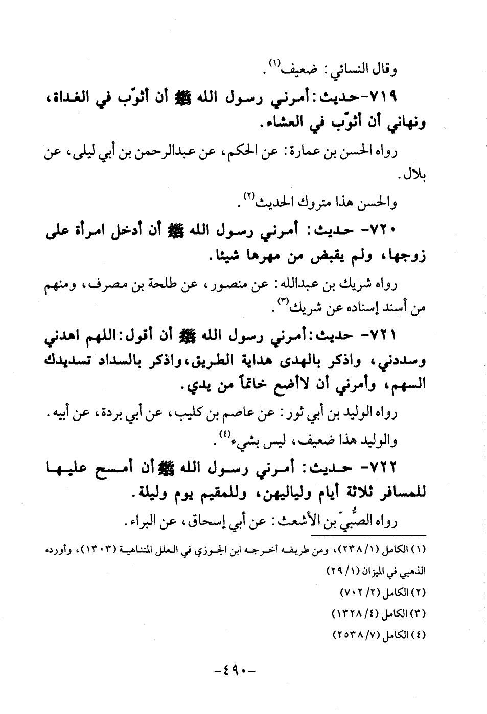 721 - حَدِيث: أَمرنِي رَسُول الله - صلى الله عَلَيْهِ وَسلم - أَن أَقُول: اللَّهُمَّ اهدني وسددني، وَاذْكُر بِالْهدى هِدَايَة الطَّرِيق، وَاذْكُر بالسداد تسديدك السهْم، وَأَمرَنِي أَن لَا أَضَع خَاتمًا من يَدي. رَوَاهُ الْوَلِيد بن أبي ثَوْر: عَن عَاصِم بن كُلَيْب، عَن أبي بردة، عَن أَبِيه. والوليد هَذَا ضَعِيف، لَيْسَ بِشَيْء.