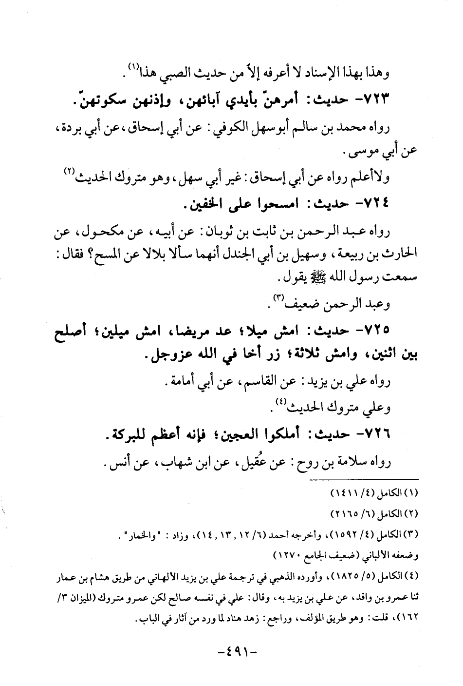724 - حَدِيث: امسحوا على الْخُفَّيْنِ. رَوَاهُ عبد الرَّحْمَن بن ثَابت بن ثَوْبَان: عَن أَبِيه، عَن مَكْحُول، عَن الْحَارِث بن ربيعَة، وَسُهيْل بن أبي الجندل أَنَّهُمَا سَأَلَا بِلَالًا عَن الْمسْح؟ فَقَالَ: سَمِعت رَسُول الله - صلى الله عَلَيْهِ وَسلم - يَقُول. وَعبد الرَّحْمَن ضَعِيف.