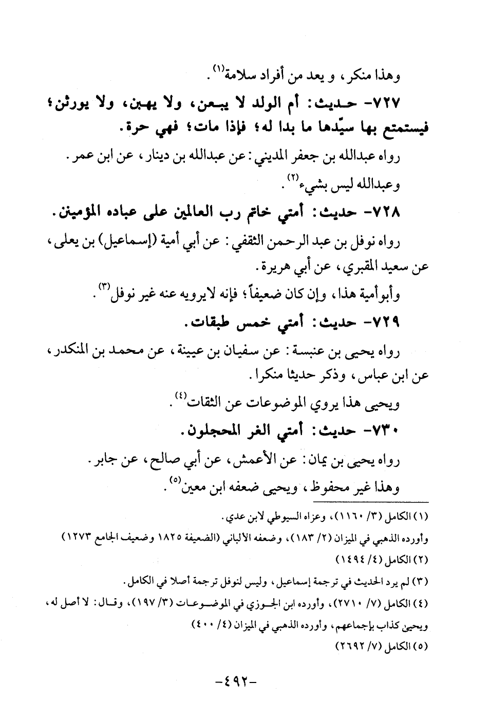 727 - حَدِيث: أم الْوَلَد لَا يبعن، وَلَا يهبن، وَلَا يورثن؛ فيستمتع بهَا سيّدها مَا بدا لَهُ؛ فاذا مَاتَ؛ فَهِيَ حرَّة. رَوَاهُ عبد الله بن جَعْفَر الْمَدِينِيّ: عَن عبد الله بن دِينَار، عَن ابْن عمر. وعبد الله لَيْسَ بِشَيْء.
