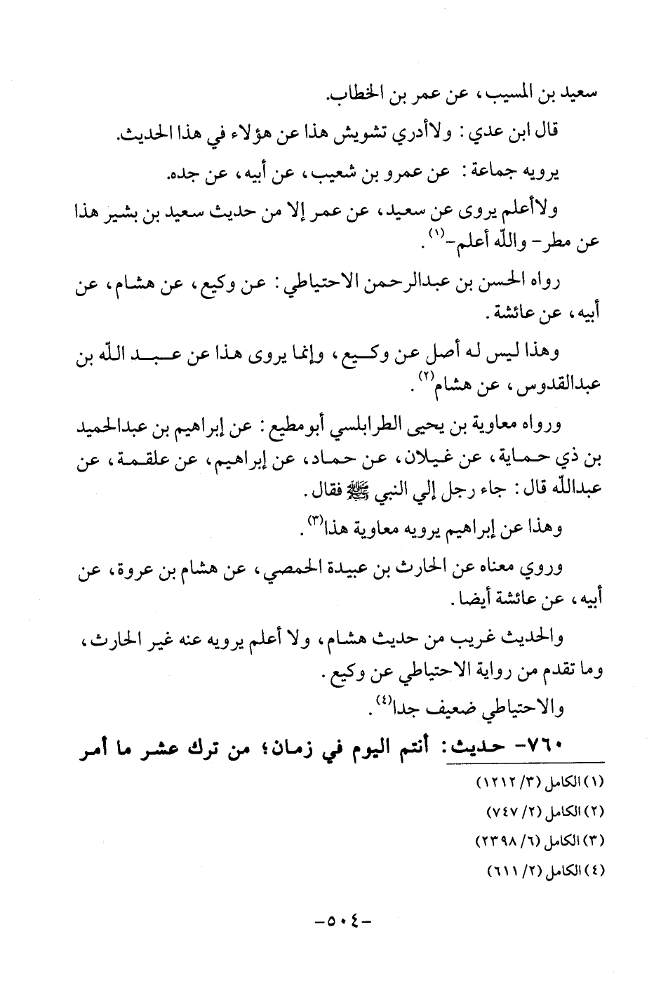 سعيد بن الْمسيب، عَن عمر بن الْخطاب. قَالَ ابْن عدي: وَلَا أَدْرِي تشويش هَذَا عَن هَؤُلَاءِ فِي هَذَا الحَدِيث. يرويهِ جمَاعَة: عَن عَمْرو بن شُعَيْب، عَن أَبِيه، عَن جده. وَلَا أعلم يرْوى عَن سعيد، عَن عمر إِلَّا من حَدِيث سعيد بن بشير هَذَا عَن مطر - وَالله أعلم -. رَوَاهُ الْحسن بن عبد الرحمن الاحتياطي: عَن وَكِيع، عَن هِشَام، عَن أَبِيه، عَن عَائِشَة. وَهَذَا لَيْسَ لَهُ أصل عَن وَكِيع، وَإِنَّمَا يرْوى هَذَا عَن عبد الله بن عبد القدوس، عَن هِشَام. وَرَوَاهُ مُعَاوِيَة بن يحيى الطرابلسي أبومطيع: عَن إِبْرَاهِيم بن عبد الحميد بن ذِي حماية، عَن غيلَان، عَن حَمَّاد، عَن إِبْرَاهِيم، عَن عَلْقَمَة، عَن عبد الله قَالَ: جَاءَ رجل إِلَيّ النَّبِي - صلى الله عَلَيْهِ وَسلم - فَقَالَ. وَهَذَا عَن إِبْرَاهِيم يرويهِ مُعَاوِيَة هَذَا. وَرُوِيَ مَعْنَاهُ عَن الْحَارِث بن عُبَيْدَة الْحِمصِي، عَن هِشَام بن عُرْوَة، عَن أَبِيه، عَن عَائِشَة أَيْضا. والْحَدِيث غَرِيب من حَدِيث هِشَام، وَلَا أعلم يرويهِ عَنهُ غير الْحَارِث، وَمَا تقدم من رِوَايَة الاحتياطي عَن وَكِيع. والاحتياطي ضَعِيف جدا.