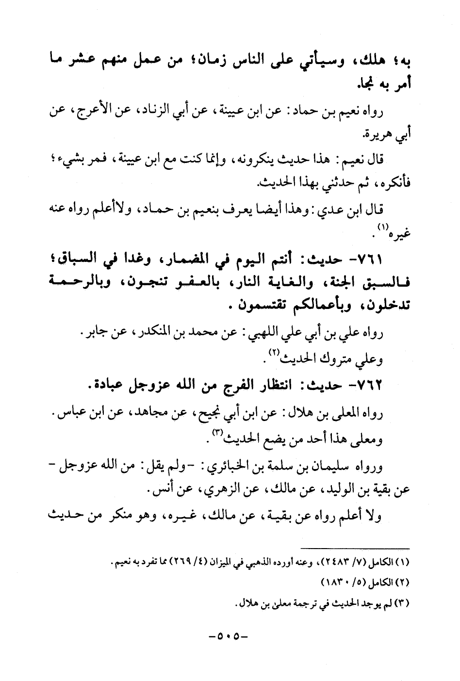 762 - حَدِيث: انْتِظَار الْفرج من الله عزوجل عبَادَة. رَوَاهُ الْمُعَلَّى بن هِلَال: عَن ابْن أبي نجيح، عَن مُجَاهِد، عَن ابْن عَبَّاس. وَمعلى هَذَا أحد من يضع الحَدِيث. وَرَوَاهُ سُلَيْمَان بن سَلمَة بن الخبائري: - وَلم يقل: من الله عزوجل - عَن بَقِيَّة بن الْوَلِيد، عَن مَالك، عَن الزُّهْرِيّ، عَن أنس. وَلَا أعلم رَوَاهُ عَن بَقِيَّة، عَن مَالك، غَيره، وَهُوَ مُنكر من حَدِيث