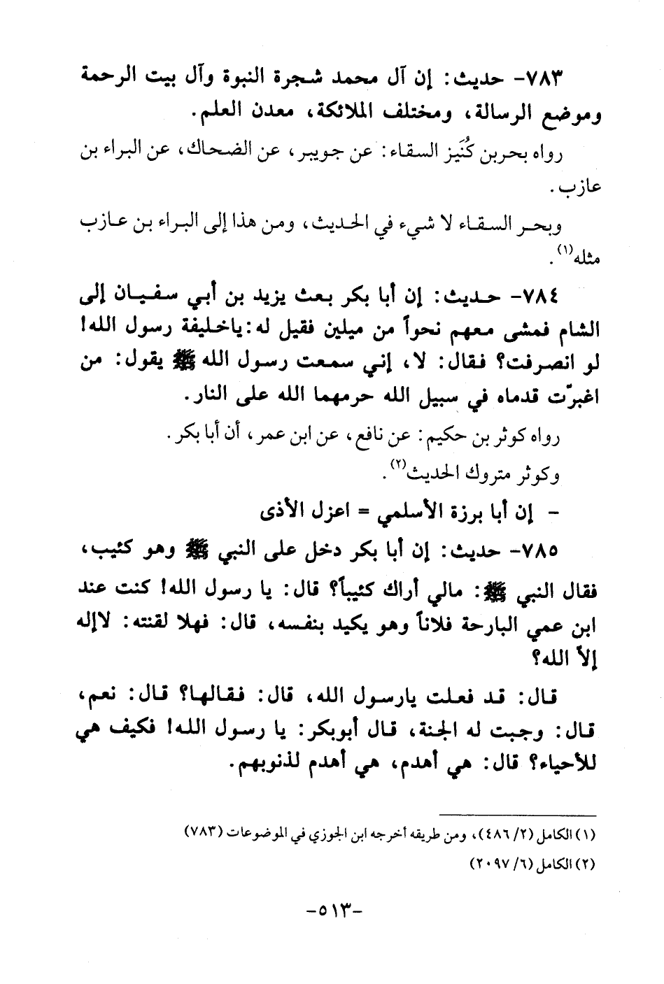 784 - حَدِيث: إِن أَبَا بكر بعث يزِيد بن أبي سفبان إِلَى الشَّام فَمشى مَعَهم نَحوا من ميلين فَقيل لَهُ: ياخليفة رَسُول الله {لَو انصرفت؟ فَقَالَ: لَا، اني سَمِعت رَسُول الله - صلى الله عَلَيْهِ وَسلم - يَقُول: من اغبرّت قدماه فِي سَبِيل الله حرمهما الله على النَّار. رَوَاهُ كوثر بن حَكِيم: عَن نَافِع، عَن ابْن عمر، أَن أَبَا بكر. وكوثر مَتْرُوك الحَدِيث. - إِن أَبَا بَرزَة الْأَسْلَمِيّ = اعزل الْأَذَى.