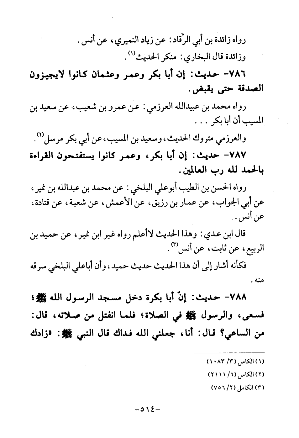 787 - حَدِيث: ان أَبَا بكر، وَعمر كَانُوا يستفتحون الْقِرَاءَة بِالْحَمْد لله رب الْعَالمين. رَوَاهُ الْحسن بن الطّيب أَبُو عَليّ الْبَلْخِي: عَن مُحَمَّد بن عبد الله بن نمير، عَن أبي الْجَواب، عَن عمار بن رُزَيْق، عَن الْأَعْمَش، عَن شُعْبَة، عَن قَتَادَة، عَن أنس. قَالَ ابْن عدي: وَهَذَا الحَدِيث لَا أعلم رَوَاهُ غير ابْن نمير، عَن حميد بن الرّبيع، عَن ثَابت، عَن أنس. فَكَأَنَّهُ أَشَارَ إِلَى أَن هَذَا الحَدِيث حَدِيث حميد، وَأَن أَبَا عَليّ الْبَلْخِي سَرقه مِنْهُ.