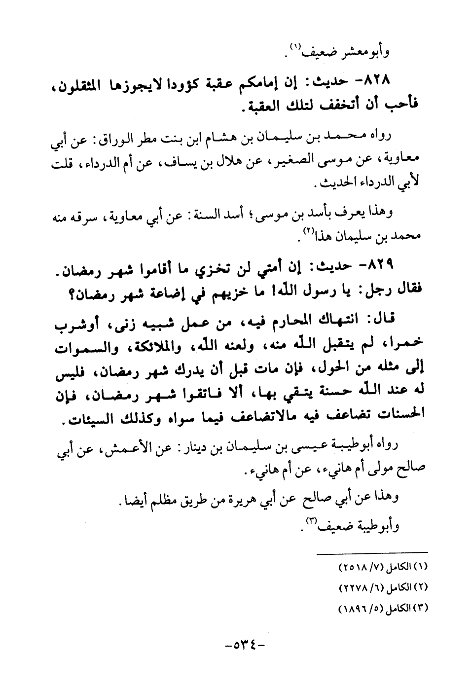828 - حَدِيث: إِن إمامكم عفبة كؤودا لايجوزها المثقلون، فَأحب أَن أتخفف لتِلْك الْعقبَة. رَوَاهُ مُحَمَّد بن سُلَيْمَان بن هِشَام ابْن بنت مطر الْوراق: عَن أبي مُعَاوِيَة، عَن مُوسَى الصَّغِير، عَن هِلَال بن يسَاف، عَن أم الدَّرْدَاء، قلت لأبي الدَّرْدَاء الحَدِيث. وَهَذَا يعرف بأسد بن مُوسَى؛ أَسد السّنة: عَن أبي مُعَاوِيَة، سَرقه مِنْهُ مُحَمَّد بن سُلَيْمَان هَذَا.