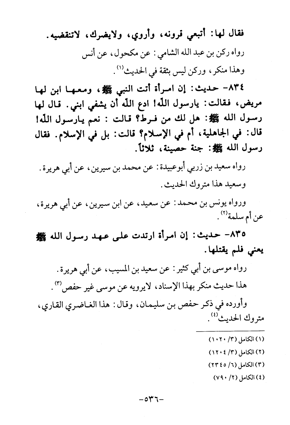 835 - حَدِيث: إِن امْرَأَة ارْتَدَّت على عهد رَسُول الله - صلى الله عَلَيْهِ وَسلم - يَعْنِي فَلم يَقْتُلهَا. رَوَاهُ مُوسَى بن أبي كثير: عَن سعيد بن الْمسيب، عَن أبي هُرَيْرَة. هَذَا حَدِيث مُنكر بهدا الْإِسْنَاد، لايرويه عَن مُوسَى غير حَفْص. وَأوردهُ فِي ذكر حَفْص بن سُلَيْمَان، وَقَالَ: هَذَا الغاضري الْقَارِي، مَتْرُوك الحَدِيث.