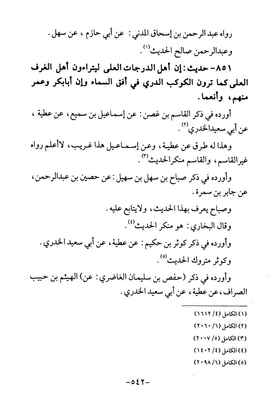 851 - حَدِيث: ان أهل الدَّرَجَات العلى ليتراءون أهل الغرف العلى كَمَا ترَوْنَ الْكَوْكَب الدُّرِّي فِي أفق السَّمَاء وان أَبَا بكر وَعمر مِنْهُم، وأنعما. أوردهُ فِي ذكر الْقَاسِم بن غُصْن: عَن إِسْمَاعِيل بن سميع، عَن عَطِيَّة، عَن أبي سعيدالخدري. وَهَذَا لَهُ طرق عَن عَطِيَّة، وَعَن إِسْمَاعِيل هَذَا غَرِيب، لَا أعلم رَوَاهُ غيرالقاسم، وَالقَاسِم مُنكر الحَدِيث. وَأوردهُ فِي ذكر صباح بن سهل بن سُهَيْل: عَن حُصَيْن بن عبد الرحمن، عَن جَابر بن سَمُرَة. وصباح يعرف بِهَذَا الحَدِيث، ولايتابع عَلَيْهِ. وَقَالَ البُخَارِيّ: هُوَ مُنكر الحَدِيث. وَأوردهُ فِي ذكر كوثر بن حَكِيم: عَن عَطِيَّة، عَن أبي سعيد الْخُدْرِيّ. وكوثر مَتْرُوك الحَدِيث. وَأوردهُ فِي ذكر (حَفْص بن سُلَيْمَان الغاضري: عَن) الْهَيْثَم بن حبيب الصراف، عَن عَطِيَّة، عَن أبي سعيد الْخُدْرِيّ.