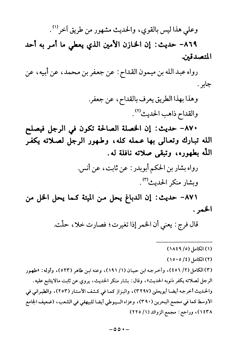 869 - حَدِيث: ان الخازن الْأمين الَّذِي يُعْطي مَا أَمر بِهِ أحد المتصدقين. رَوَاهُ عبد الله بن مَيْمُون القداح: عَن جَعْفَر بن مُحَمَّد، عَن أَبِيه، عَن جَابر. وَهَذَا بِهَذَا الطَّرِيق يعرف بِالْقداحِ، عَن جَعْفَر. والقداح ذَاهِب الحَدِيث.
