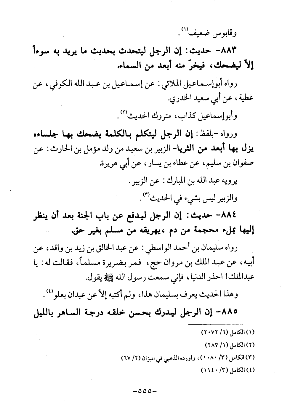 883 - حَدِيث: ان الرجل ليتحدث بِحَدِيث مَا يُرِيد بِهِ سوءا إلاّ ليضحك، فيخرّ مِنْهُ أبعد من السَّمَاء. رَوَاهُ أبوإسماعيل الْملَائي: عَن إِسْمَاعِيل بن عبد الله الْكُوفِي، عَن عَطِيَّة، عَن أبي سعيد الْخُدْرِيّ. وَأَبُو إِسْمَاعِيل كَذَّاب، مَتْرُوك الحَدِيث. وَرَوَاهُ - بِلَفْظ: إِن الرجل ليَتَكَلَّم بِالْكَلِمَةِ يضْحك بهَا جلساءه يزل بهَا أبعد من الثريا - الزبير بن سعيد من ولد مُؤَمل بن الْحَارِث: عَن صَفْوَان بن سليم، عَن عَطاء بن يسَار، عَن أبي هُرَيْرَة. يرويهِ عبد الله بن الْمُبَارك: عَن الزبير. وَالزُّبَيْر لَيْسَ بِشَيْء فِي الحَدِيث.