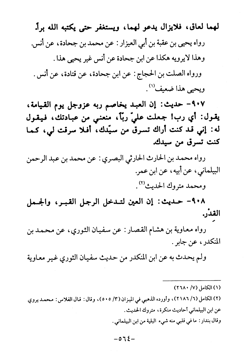 907 - حَدِيث: ان العَبْد يُخَاصم ربه عزوجل يَوْم الْقِيَامَة، يَقُول: أَي رب! جعلت عليّ ربّاً، مَنَعَنِي من عبادتك، فَيَقُول لَهُ: إِنِّي قد كنت أَرَاك تسرق من سيّدك، أَفلا سرقت لي، كَمَا كنت تسرق من سيدك. رَوَاهُ مُحَمَّد بن الْحَارِث الحارفي الْبَصْرِيّ: عَن مُحَمَّد بن عبد الرَّحْمَن الْبَيْلَمَانِي، عَن أَبِيه، عَن إِبْنِ عمر. وَمُحَمّد مَتْرُوك الحَدِيث.