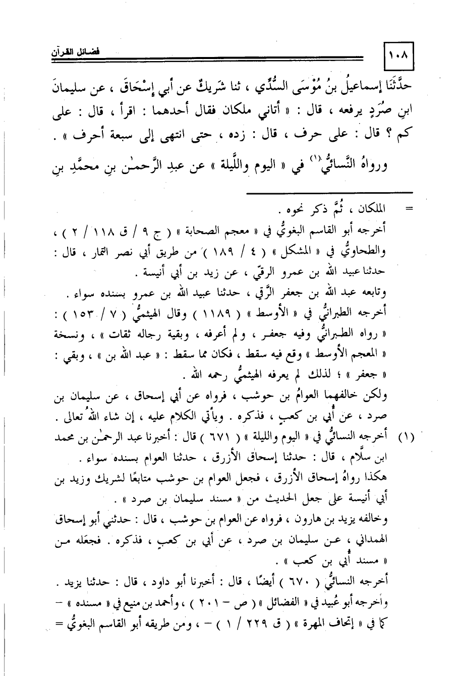 حدثنا إسماعيل بن موسى السدى، ثنا شريك عن أبى إسحاق، عن سليمان بن صرد يرفعه، قال: "أتانى ملكان فقال أحدهما: اقرأ، قال: "على كم"؟ قال: على حرف، قال: "زده، حتى انتهى إلى سبعة أحرف ".